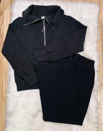 Women’s Zenana Ribbed High Neck Half Zip Pants Set Black