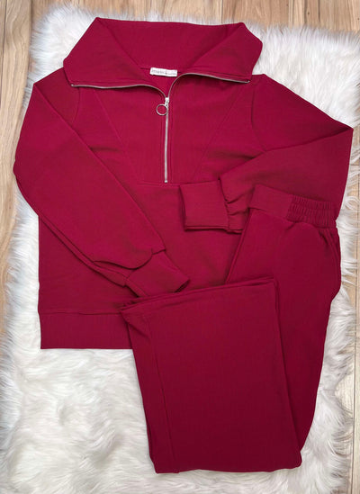 Women’s Zenana Ribbed High Neck Half Zip Pants Set Burgundy