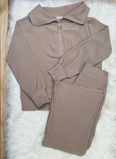 Women’s Zenana Ribbed High Neck Half Zip Pants Set Ash Mocha