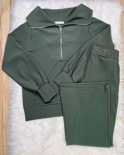Women’s Zenana Ribbed High Neck Half Zip Pants Set Olive