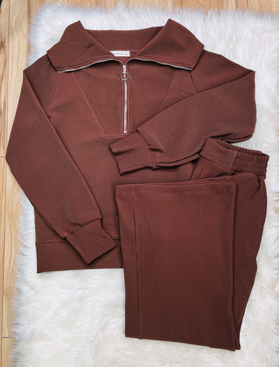 Women’s Zenana Ribbed High Neck Zipper Half Zip Pants Set Brown