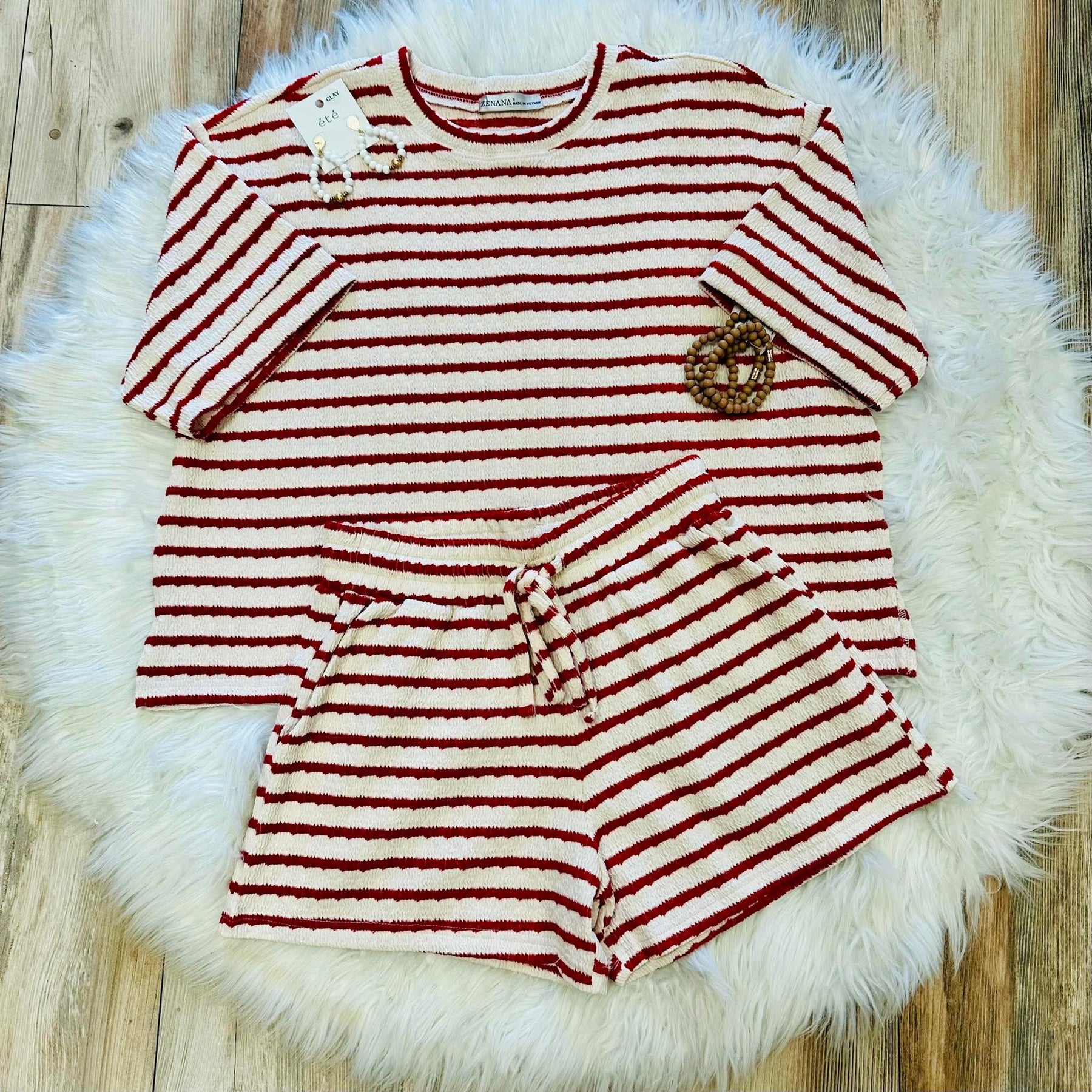 The Women’s Red Stripe Drawstring Short Set is expertly designed for comfort and versatility. The coordinated set allows for easy styling, while the drawstring feature ensures a customized fit. This outfit is ideal for warm weather, providing breathability and freedom of movement, making it suitable for various casual occasions.