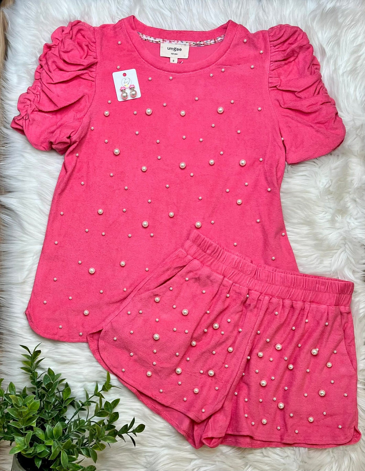 The Women’s Terry Pearl Embellished Short Set comprises a matching top and shorts, crafted for comfort and style. The soft terry fabric offers breathability, while the pearl embellishments enhance aesthetic appeal. Ideal for casual wear, this set provides versatility for everyday activities or leisure.