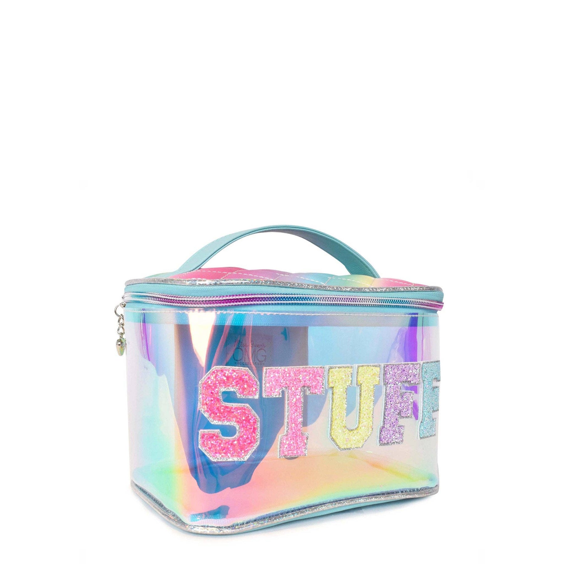 Make this 'Stuff' train case a part of your whimsical world! Crafted in a gorgeous blue glaze & topped with glitter varsity lettering, this pouch will make your organization perfected!