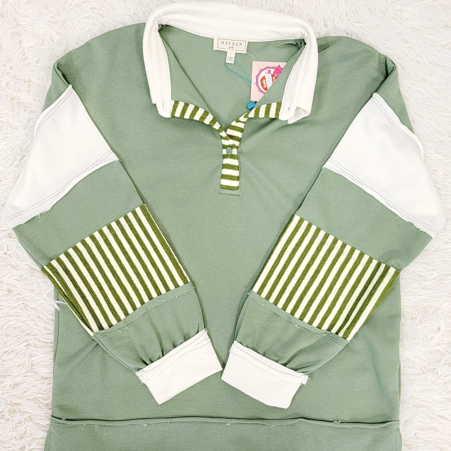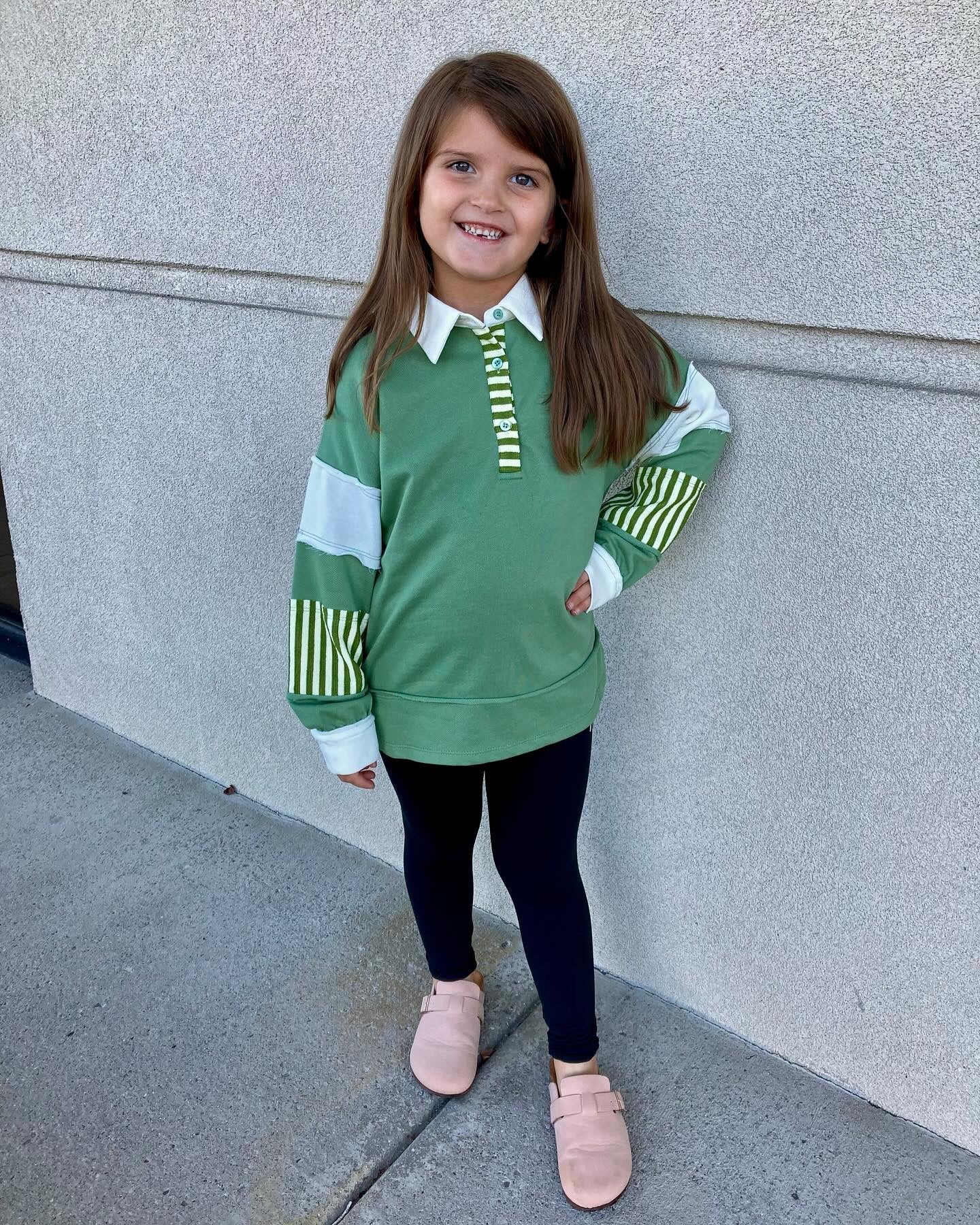Elevate your style with this trendy Girls Green and Striped Sleeve Pullover! Featuring a vibrant green hue and chic white and green striped sleeves, this pullover is a must-have for fashion-forward individuals. Add a pop of color to your wardrobe and stand out from the crowd with this stylish piece.
