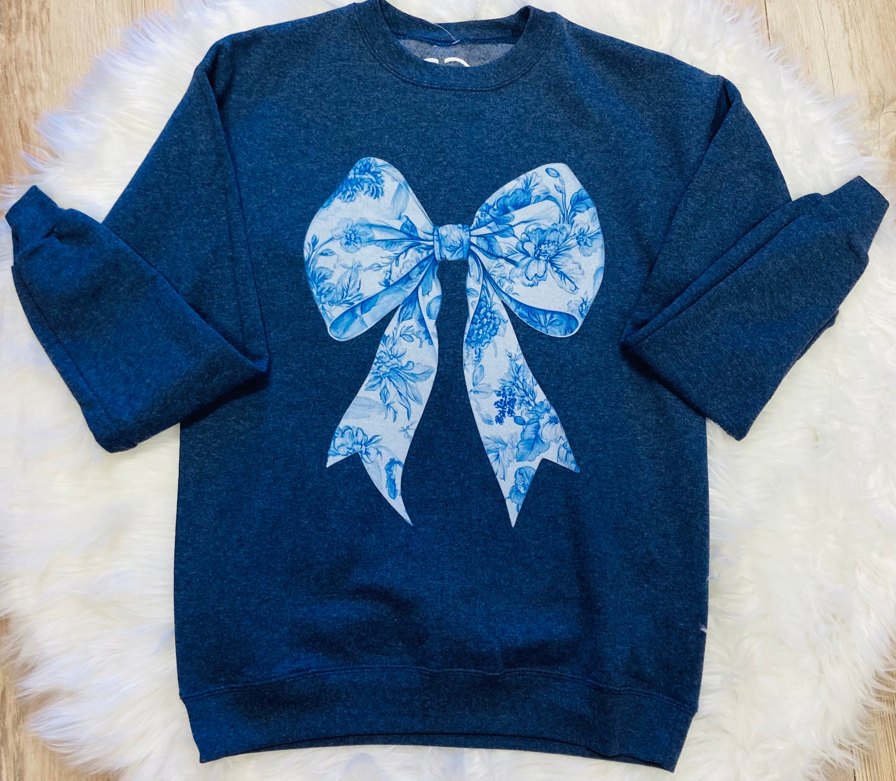 Introducing the Blue Floral Bow Crewneck. Made with a beautiful blue floral bow, this crewneck adds a sophisticated touch to any outfit. The soft material ensures comfort while the bow adds a unique and stylish element. Perfect for all occasions, this Crewneck is a must-have in any wardrobe.
