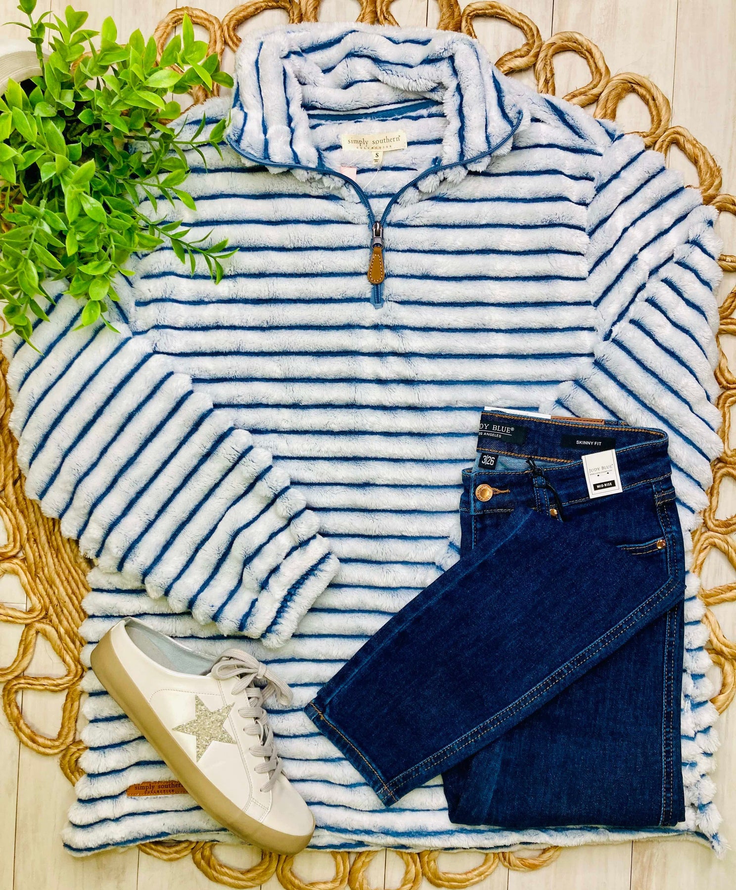 This Girls Simply Southern Sherpa Pullover combines style and comfort with its blue and white striped design and cozy Sherpa material. Perfect for cooler days, this pullover will keep your little one warm and fashionable. Made with high-quality materials and designed with your child in mind, this pullover is a must-have for any young fashionista.