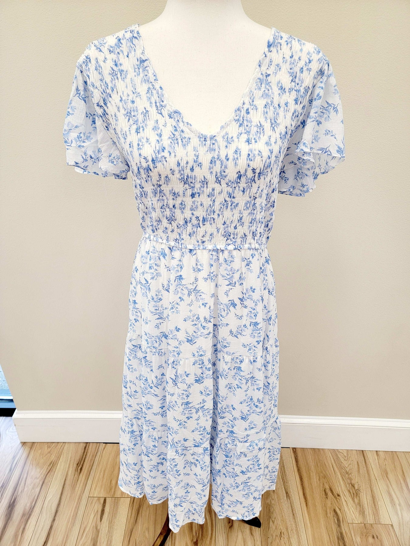 This women's maxi dress from Blu Pepper features flutter sleeves for added charm and versatility. Perfect for any occasion, this dress will elevate your style with its beautiful blue floral pattern. Stay comfortable and chic all day long with this must-have in your wardrobe.