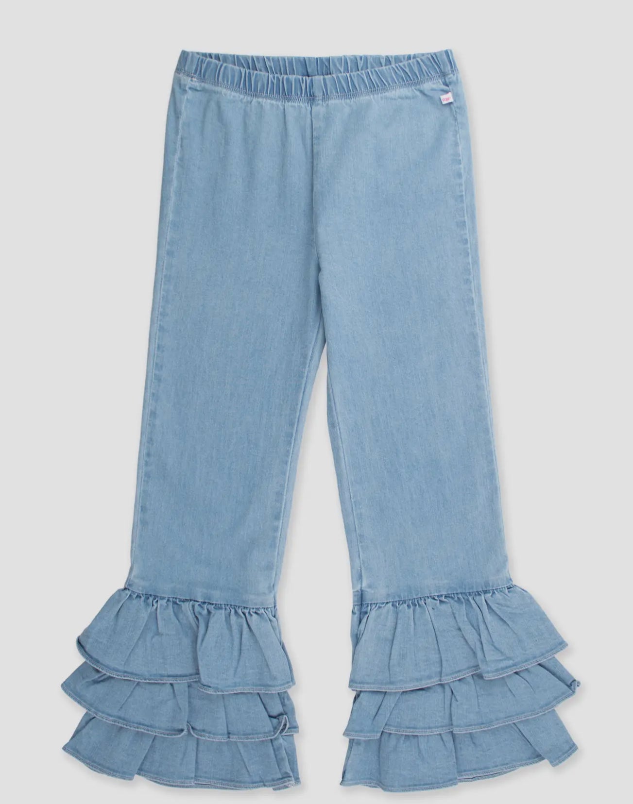 These Girls Light Wash Denim Ruffle 0-‘ts feature stylish ruffle accents that add a unique touch to any outfit. Crafted from high-quality light wash denim, these pants offer both comfort and fashion, making them a must-have for any young fashionista’s wardrobe. Elevate your little one’s style with these trendy ruffle pants.