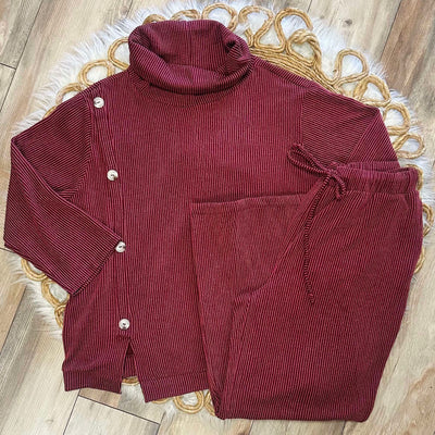 Curvy Wine Two Piece Cowl Neck Ribbed Set