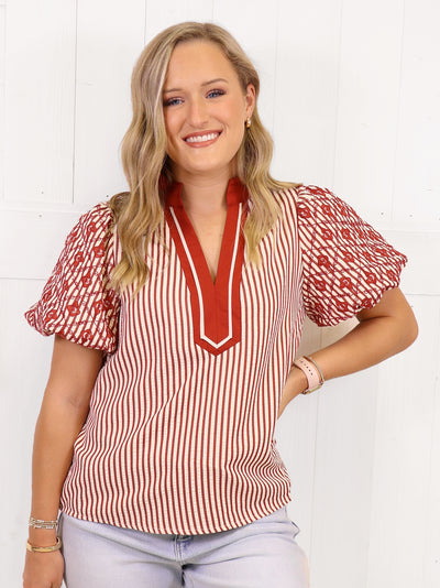 Entro Burnt Orange Mixed Print Puff Sleeve Top