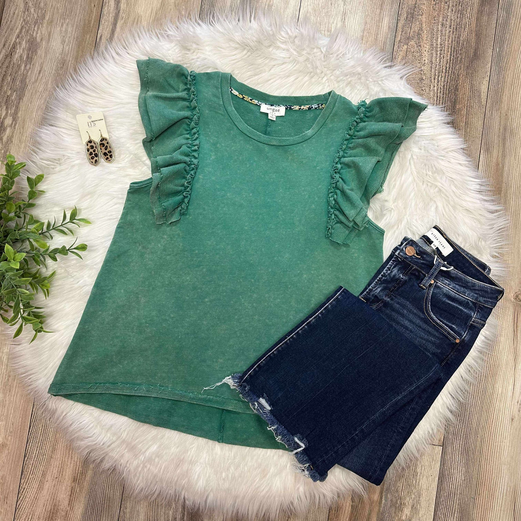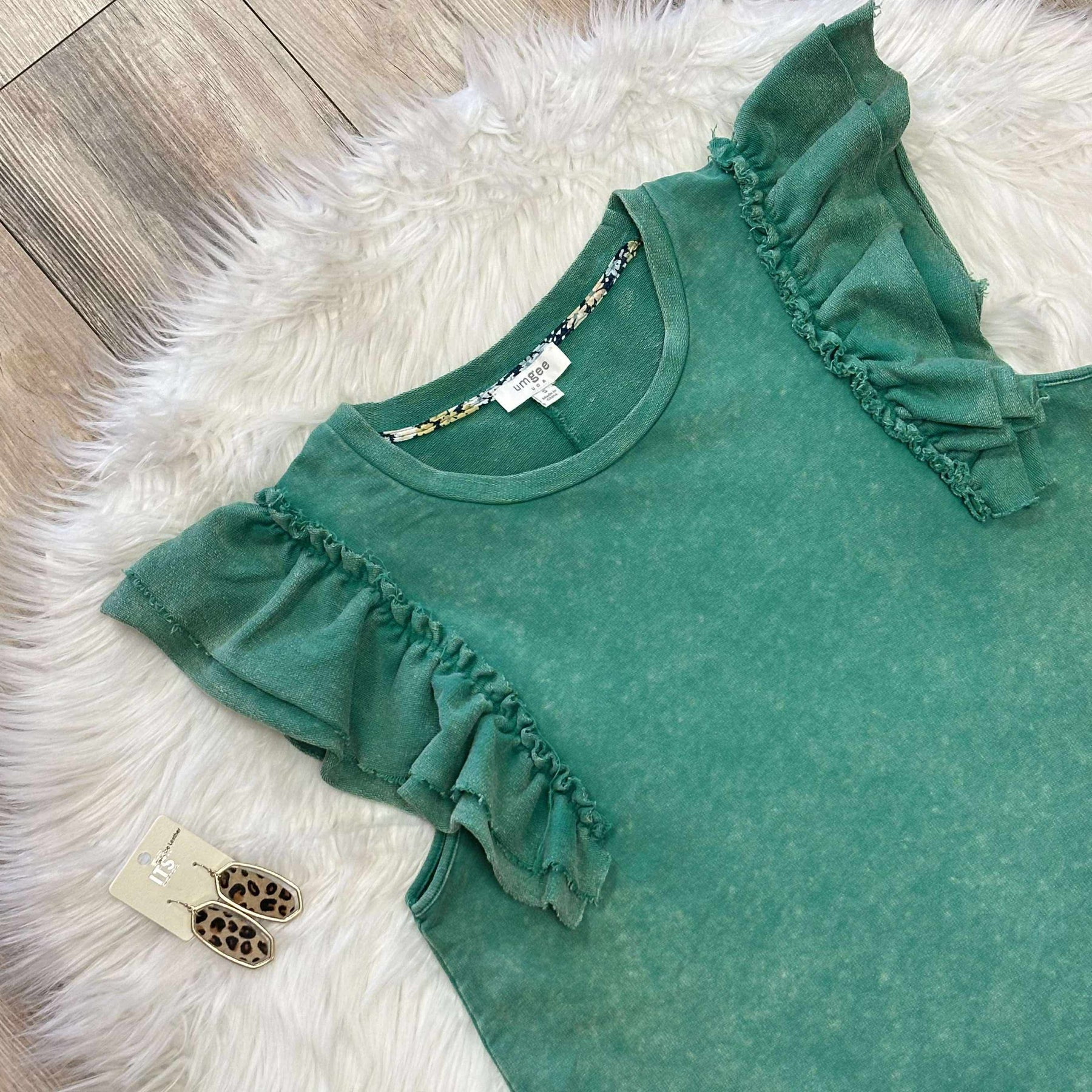 The Women’s Umgee Mineral Washed Ruffle Sleeve Top features a mineral wash finish, providing a unique texture and appearance. The ruffle sleeves enhance aesthetic appeal while offering comfort and ease of movement. This versatile top is suitable for various occasions, combining style with practical functionality.