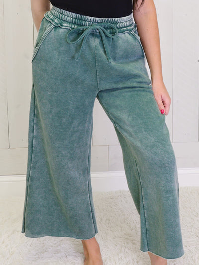 Dark Green Acid Wash Fleece Palazzo pants with pockets