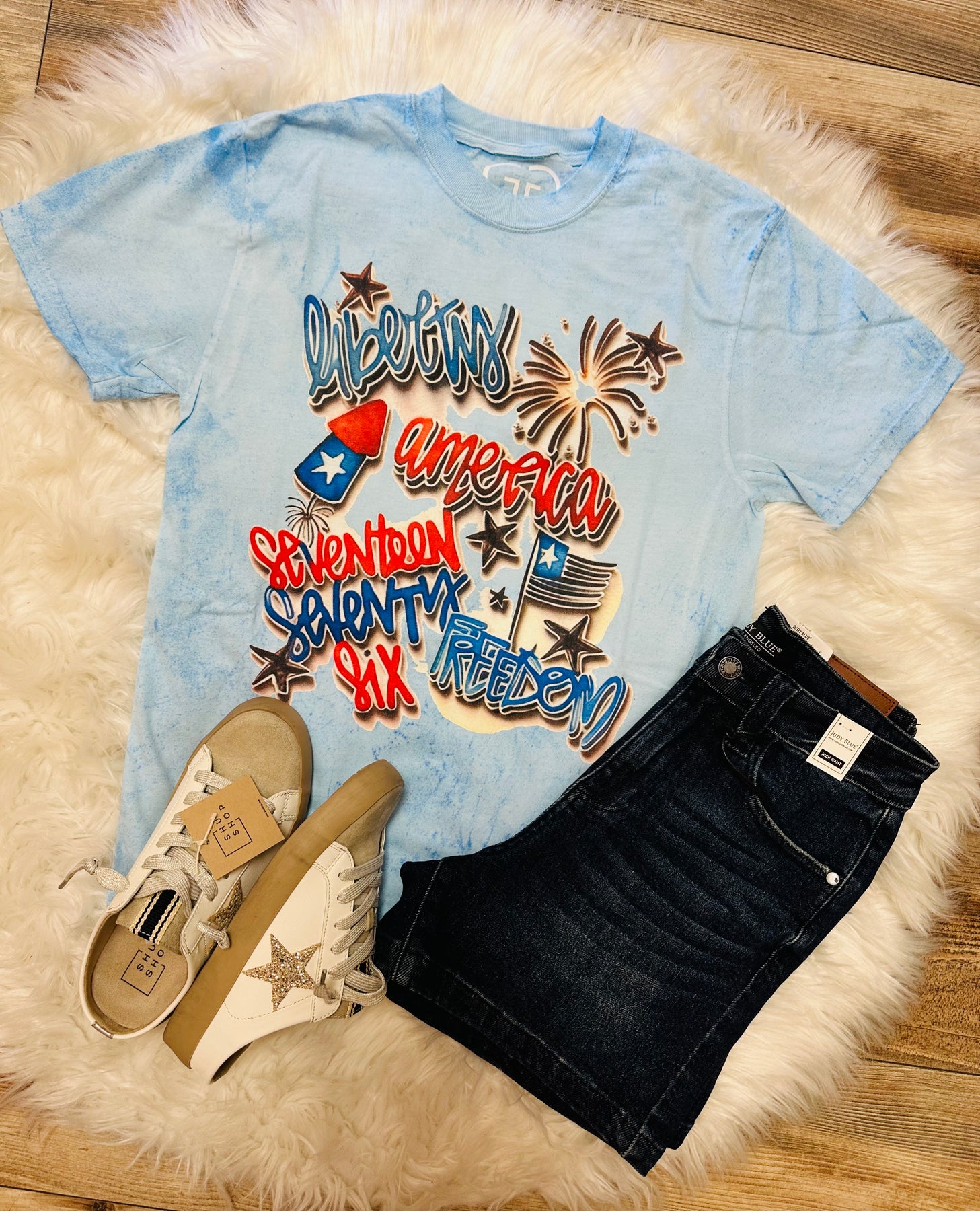 This 4th of July Tee features a beautiful blue tye dye design. The unique coloring adds a playful touch to your patriotic attire, making it perfect for all your Independence Day celebrations. Show off your American pride in style with this fun and trendy tee.