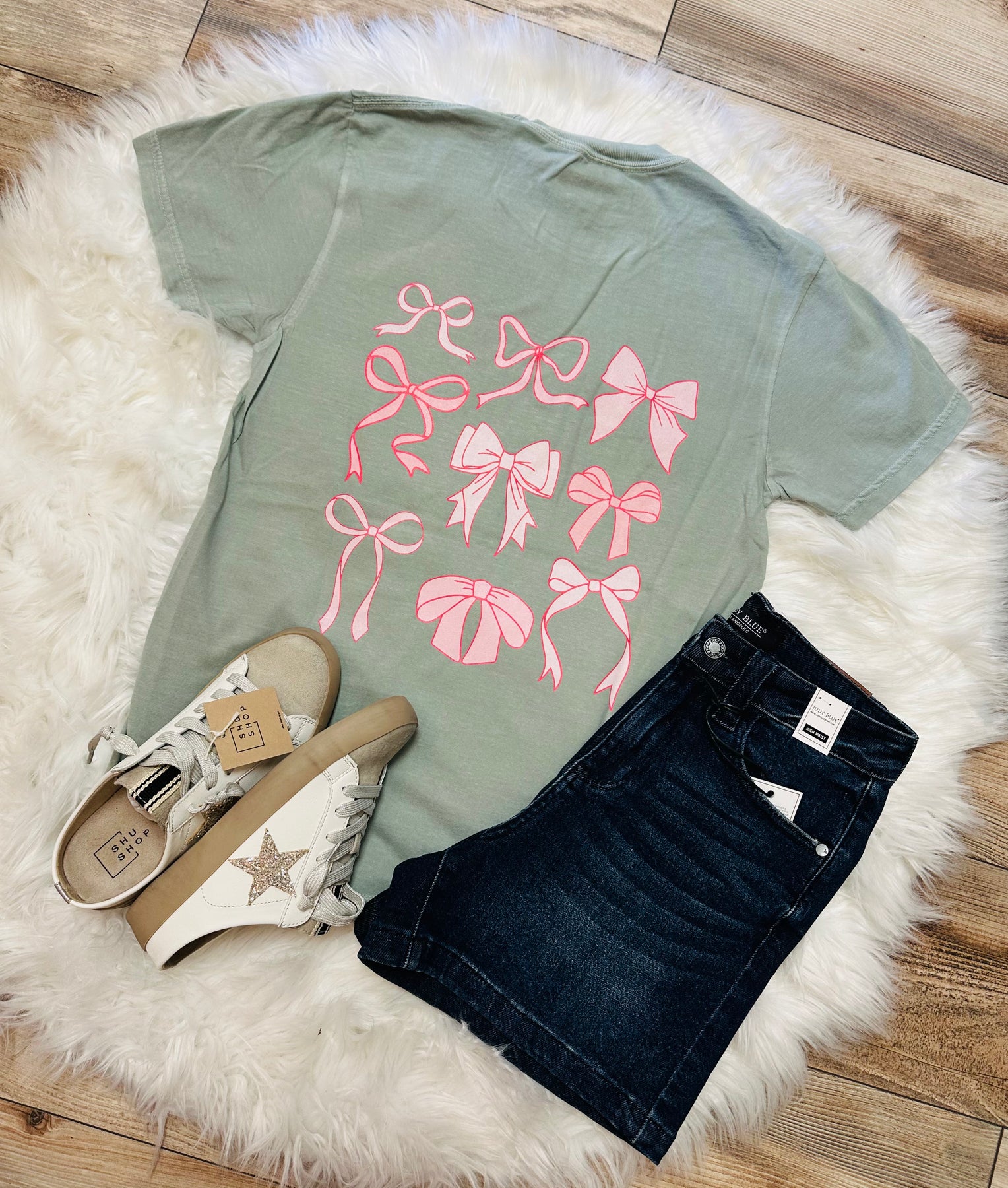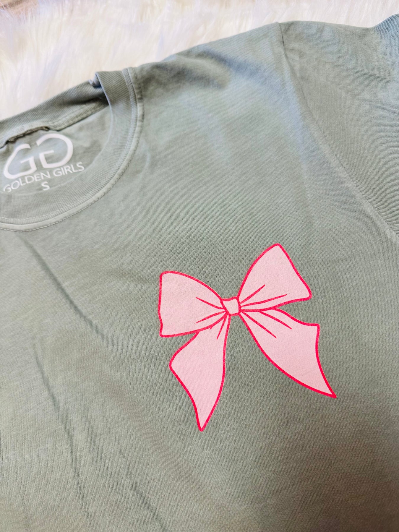 Introducing our Golden Girl’s Pink Bow Tee. This unique tee features a soft sage green color and a charming pink bow detail. Bring a touch of elegance and femininity to your wardrobe with this must-have piece. Made with high-quality materials for ultimate comfort and style. Perfect for any occasion.