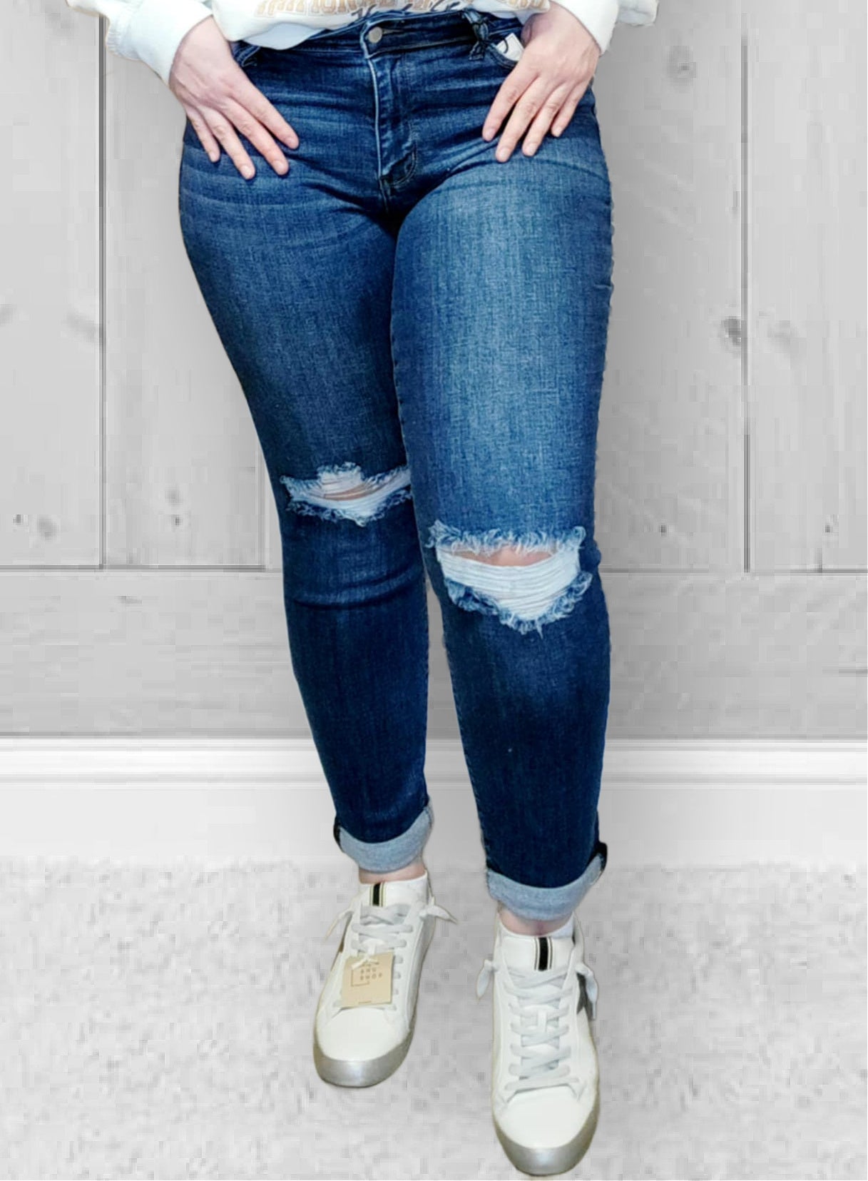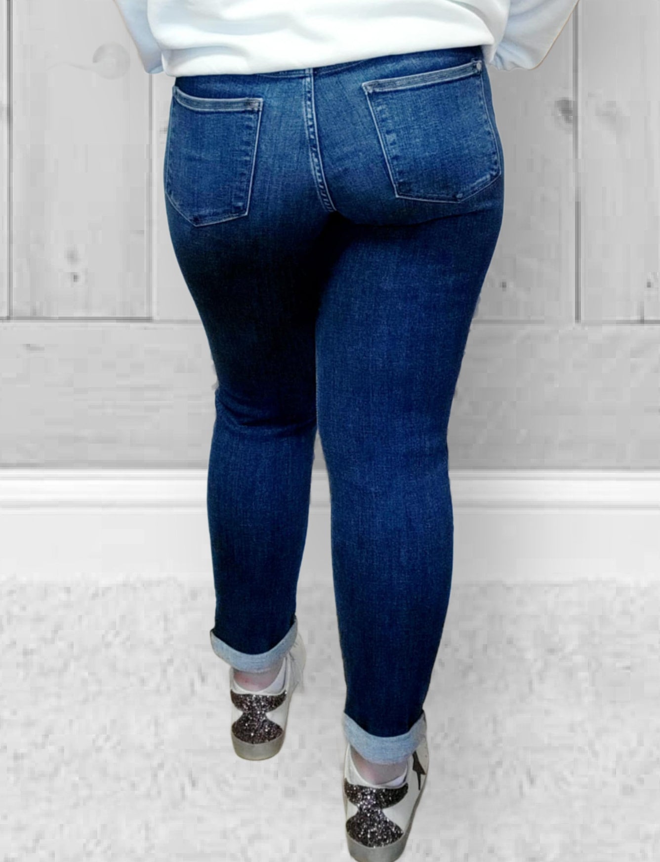 Elevate your denim game with Judy Blue Jeans 2607! In a classic dark wash with a highly requested mid rise, these slim fit jeans hug you in all the right places while giving you a little more room from the knee down. Plus, the inseam of 30.5" can be rolled for a personalized fit. Perfect for those who want the comfort of a mid rise without sacrificing style.