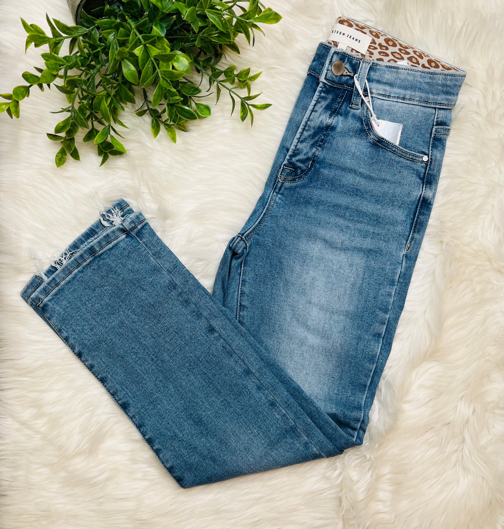 Elevate your style with Risen High Rise Medium Wash jeans. These straight-cut jeans provide a classic look with a modern twist. The high-rise waistline elongates your silhouette while the medium wash offers versatility for any occasion. Made with quality materials, these jeans will provide comfort and durability for all-day wear.