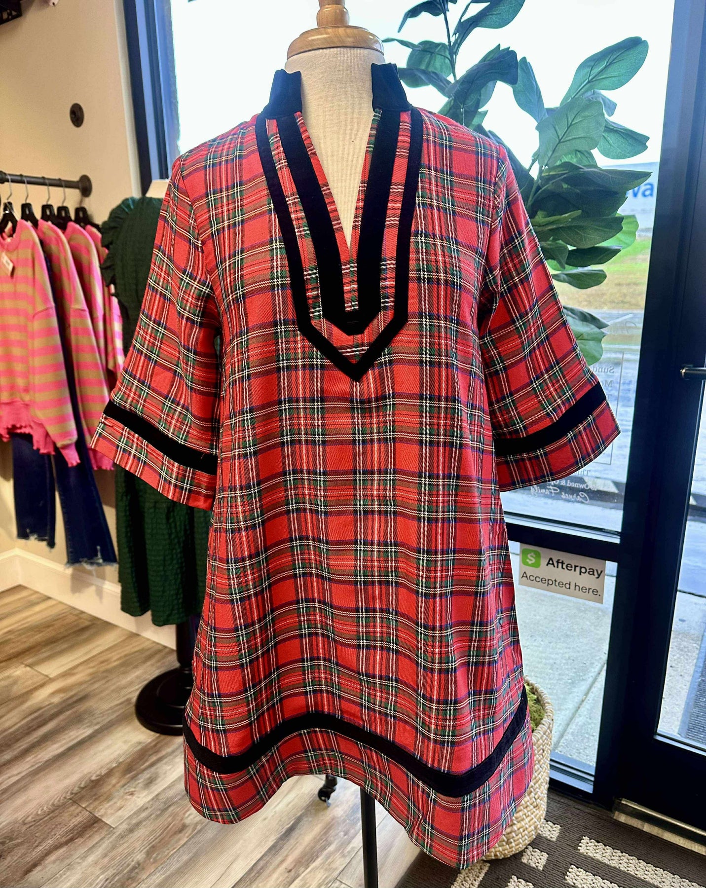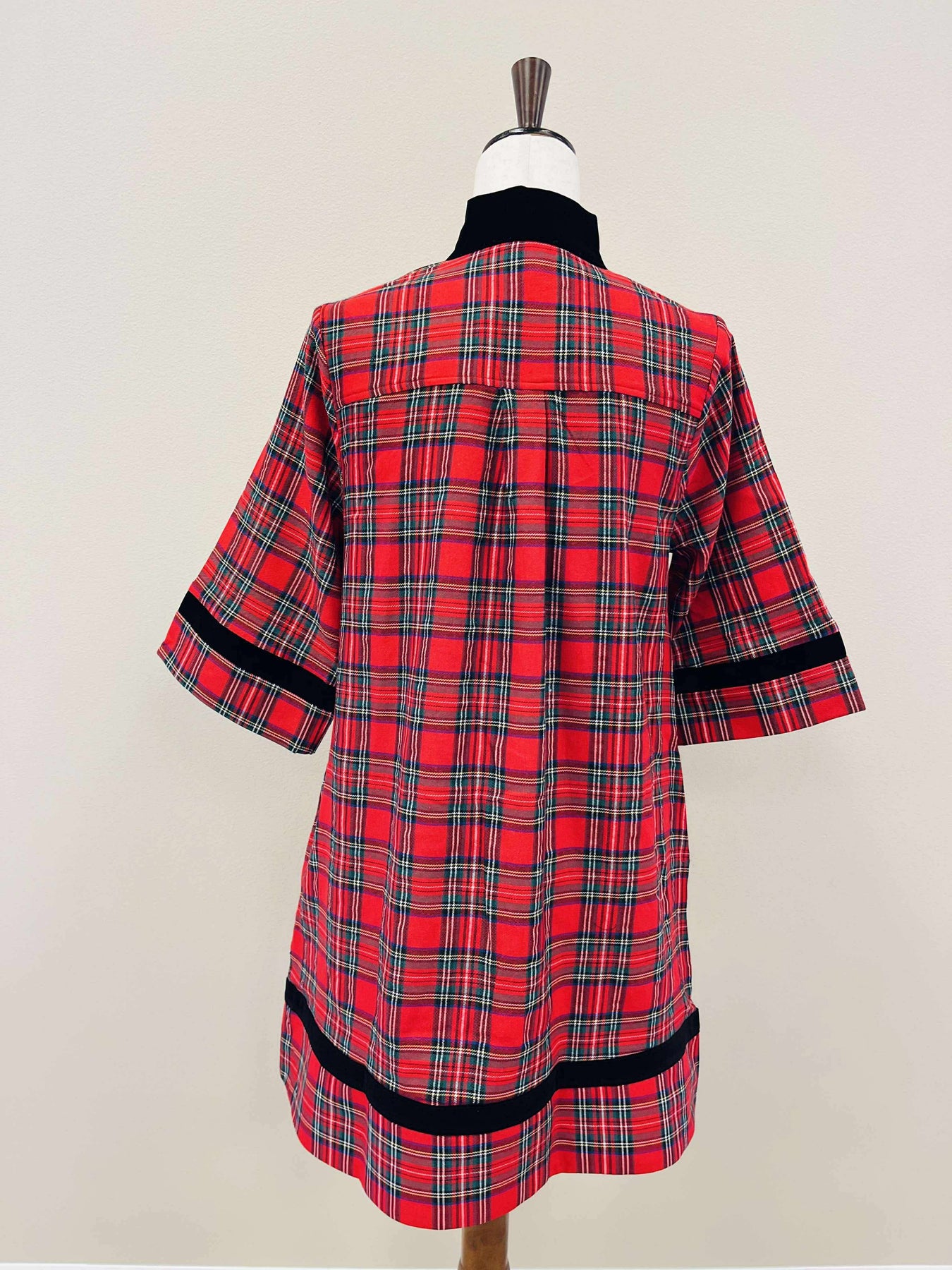 This women's red plaid velvet trim dress is a fashionable choice for any occasion. Made with a soft velvet trim, this dress offers both comfort and style. Its classic plaid pattern adds a touch of sophistication, making it perfect for work or a night out.