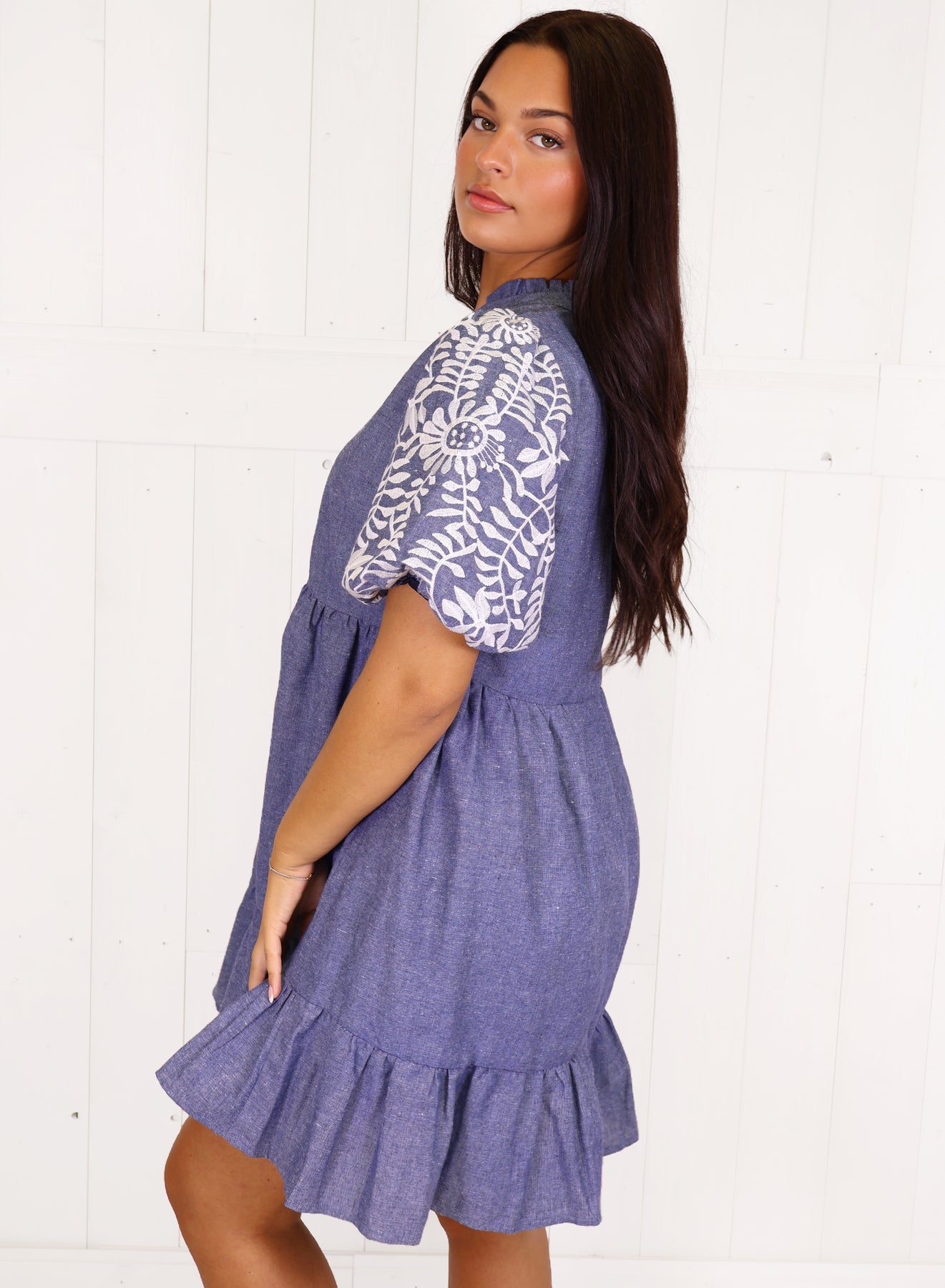 This VOY Denim dress boasts beautiful embroidered sleeves, elevating the classic denim style with a touch of elegance. Crafted with high-quality denim material, this dress offers both durability and style. Stay both comfortable and fashionable with this must-have wardrobe staple.