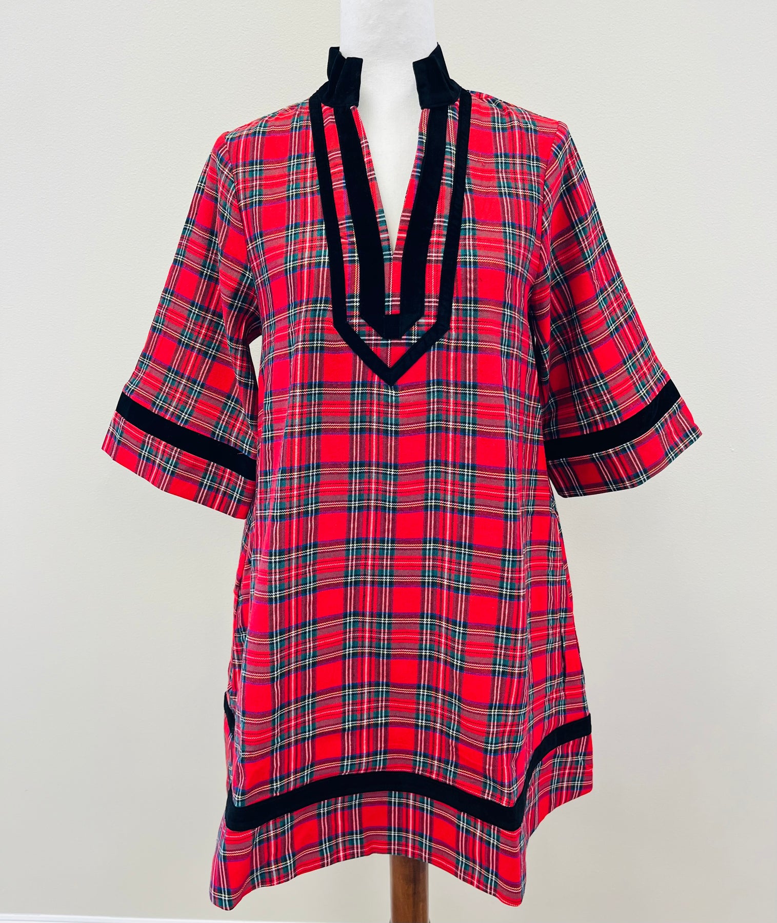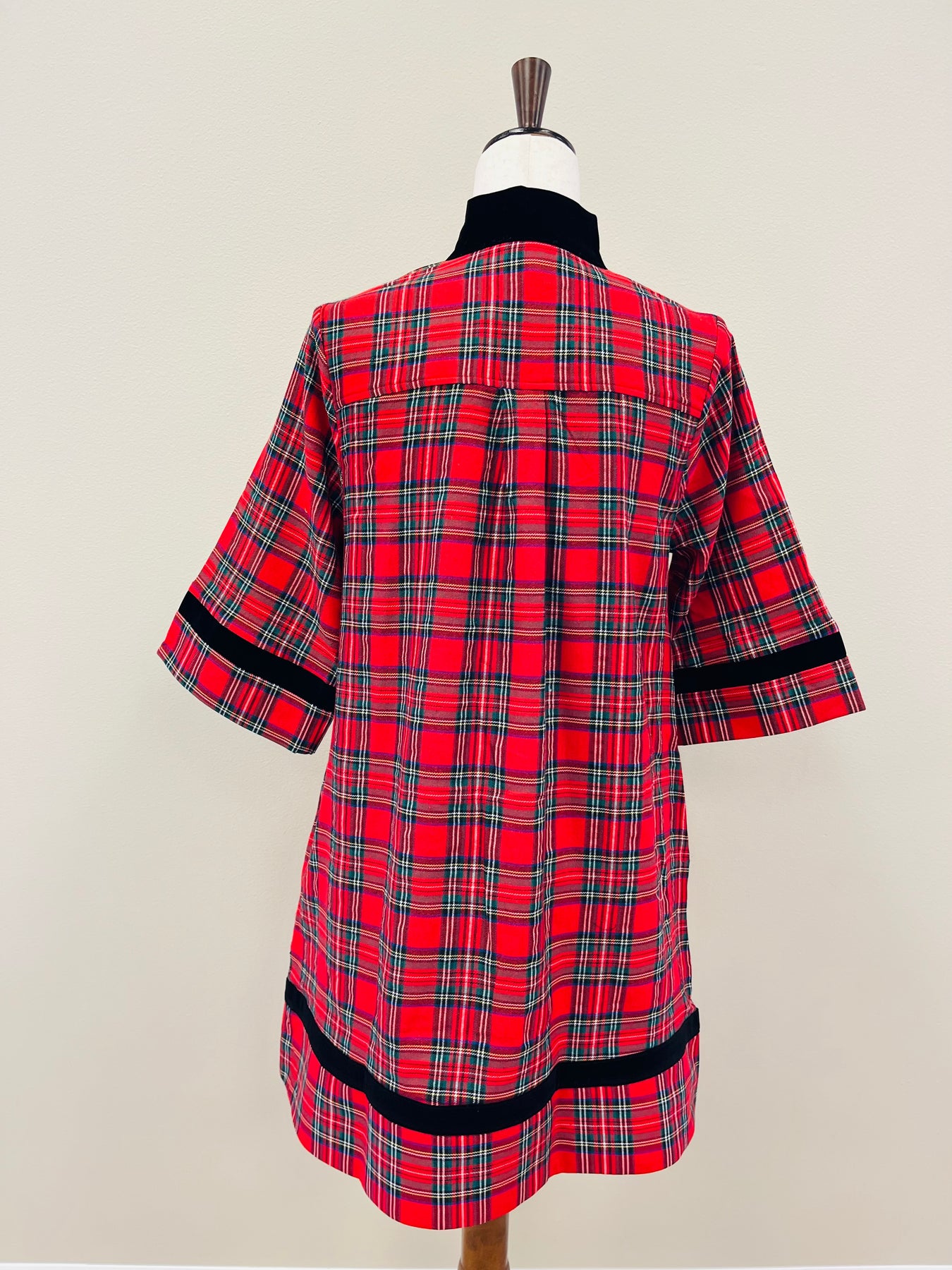 The Women's Red Plaid Dress features a classic red plaid pattern accented with black trim. This design combines traditional aesthetics with contemporary style, suitable for various occasions. The fabric composition provides comfort, while the color scheme enhances versatility in styling options.