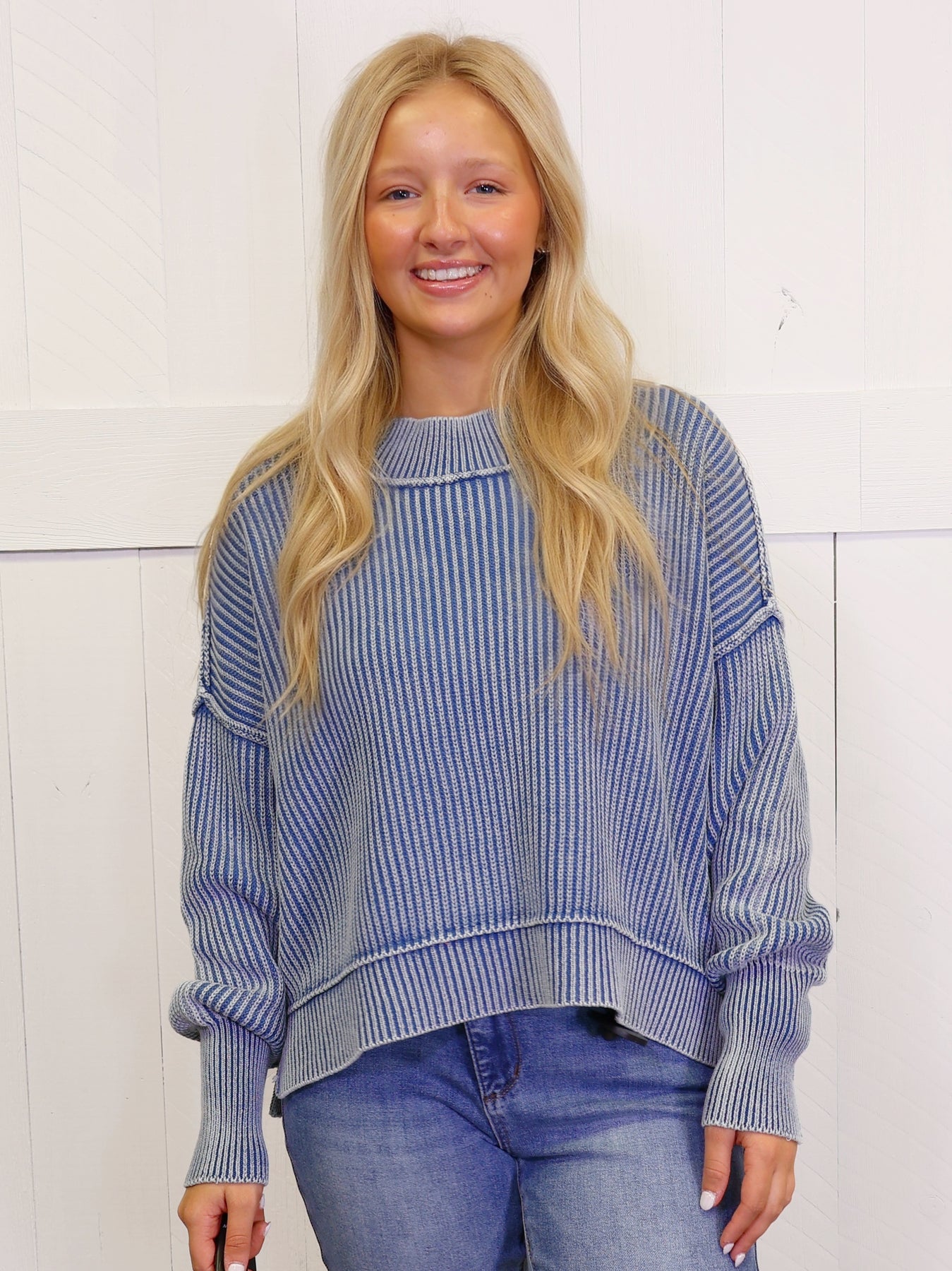 Dusty Basic Blue Washed Side Slit Oversized Cropped Sweater Pullover