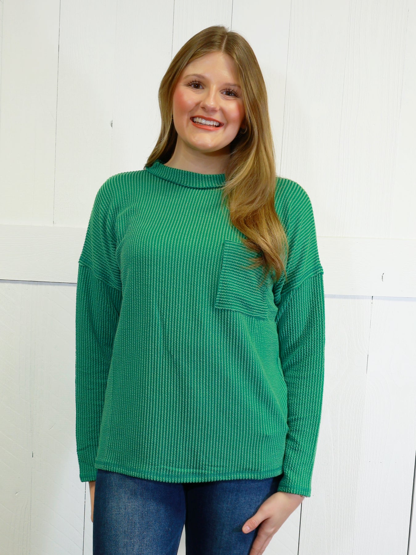 Zenana Basic Ribbed Raw Edge Pocket Top Dark Green