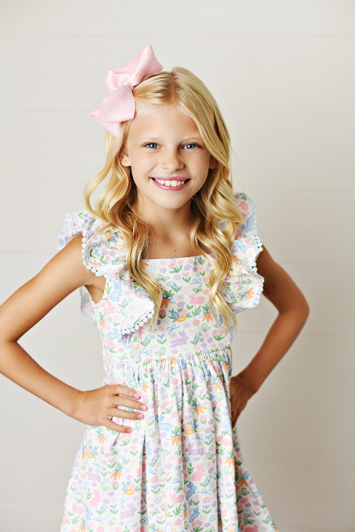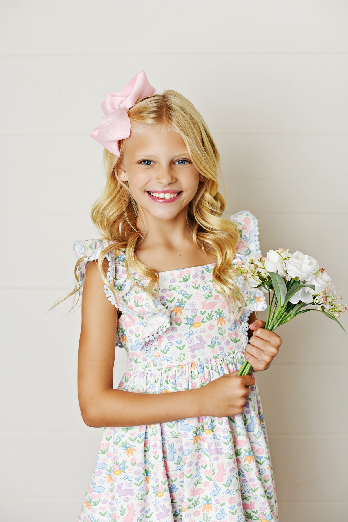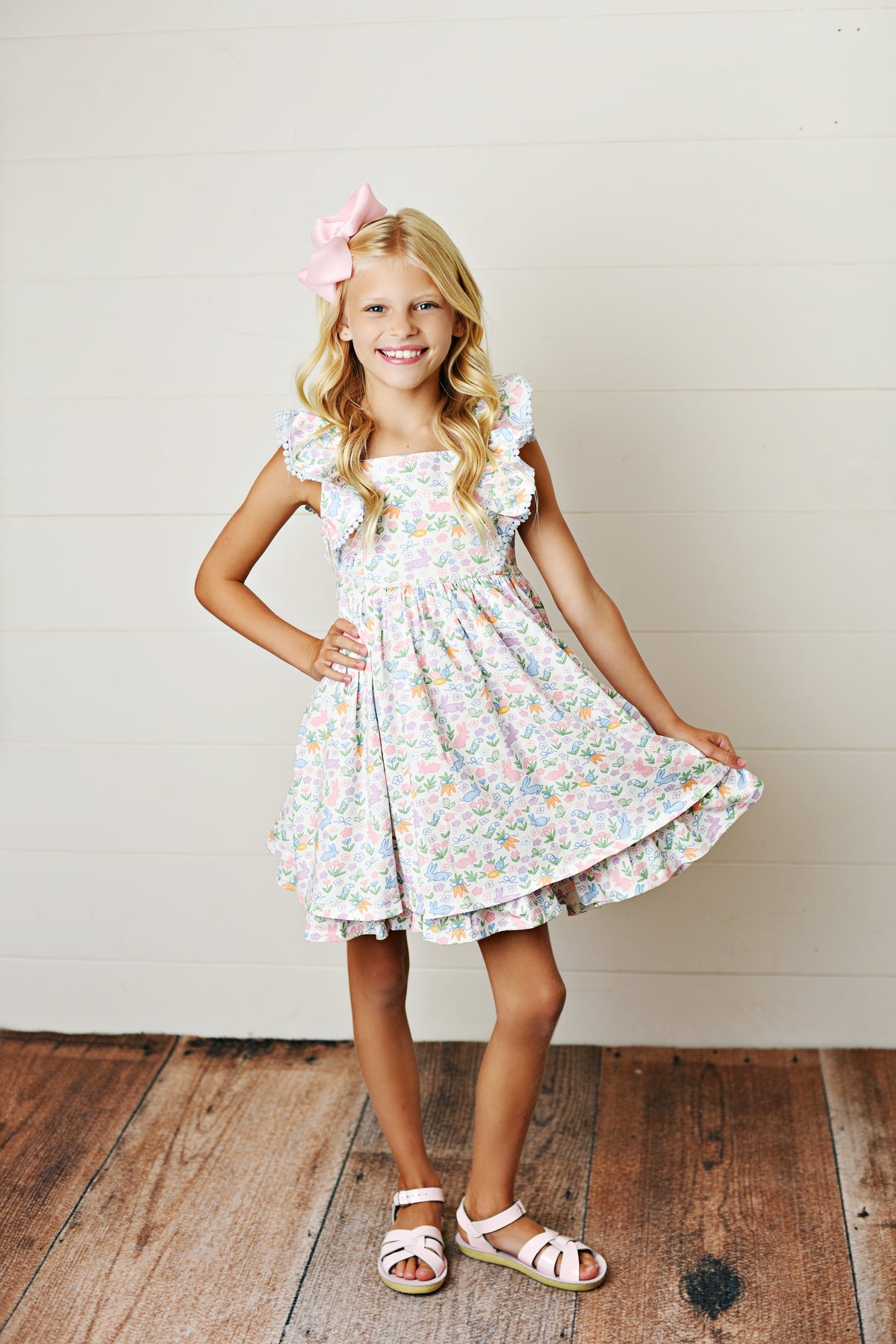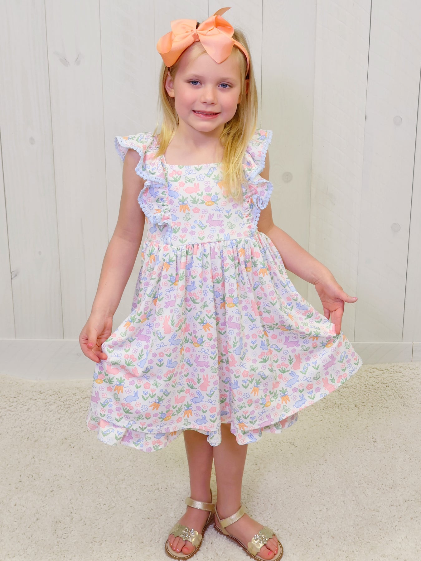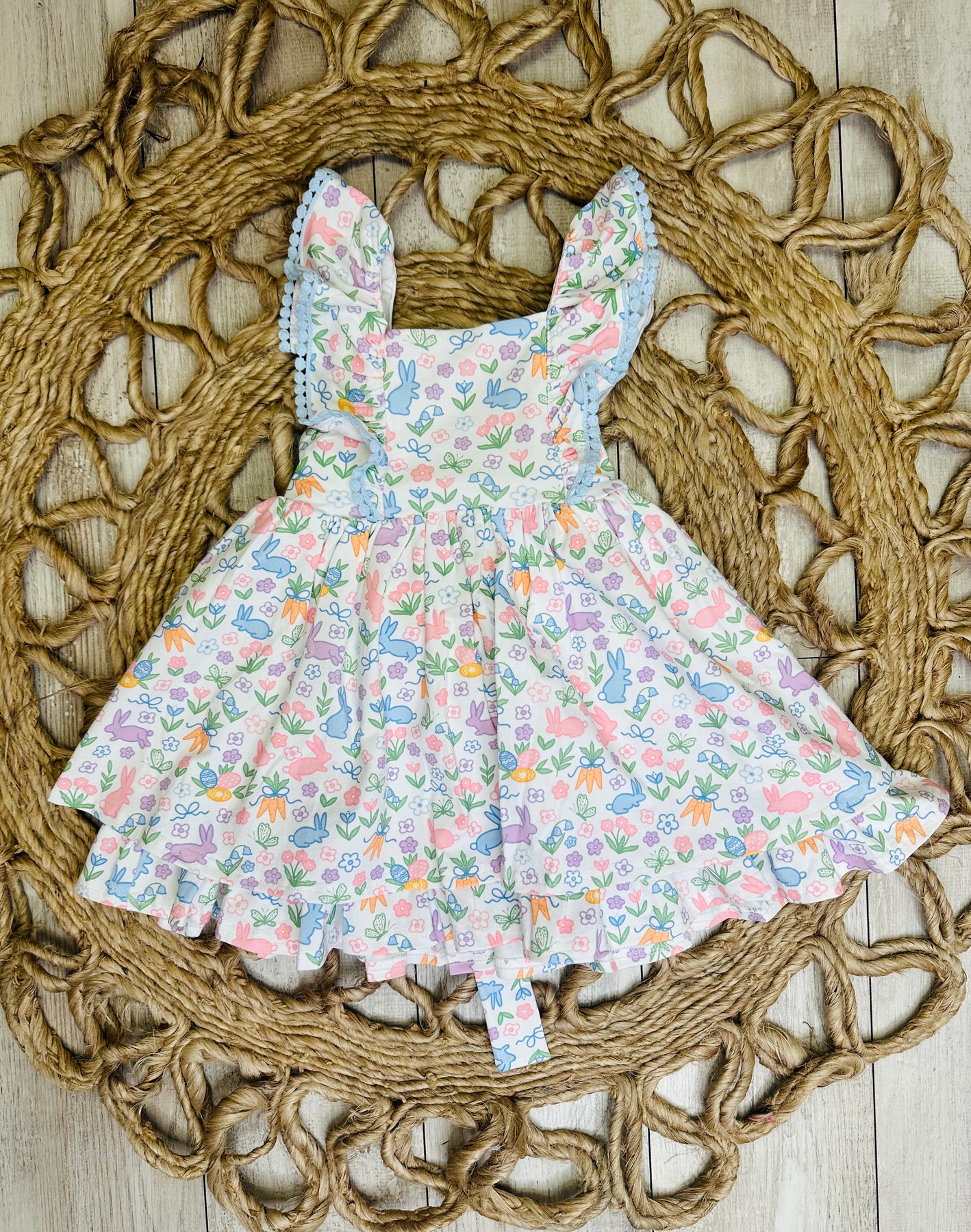 This Swoon Baby Brand Easter Dress is adorned with a charming design featuring bunnies, carrots, florals, and butterflies. Made for springtime celebrations, this dress will add a playful touch to any Easter gathering. Celebrate the season in style and comfort with this lovely dress.