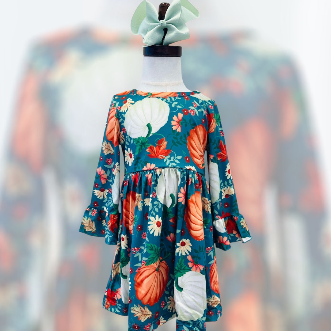 Introducing our Girls Fall Pumpkin Print Dress, perfect for the autumn season. This dress is made specifically for fall, keeping your little girl stylish and comfortable. Its design features a fun and festive pumpkin print, making it a must-have for any fall event or everyday wear.