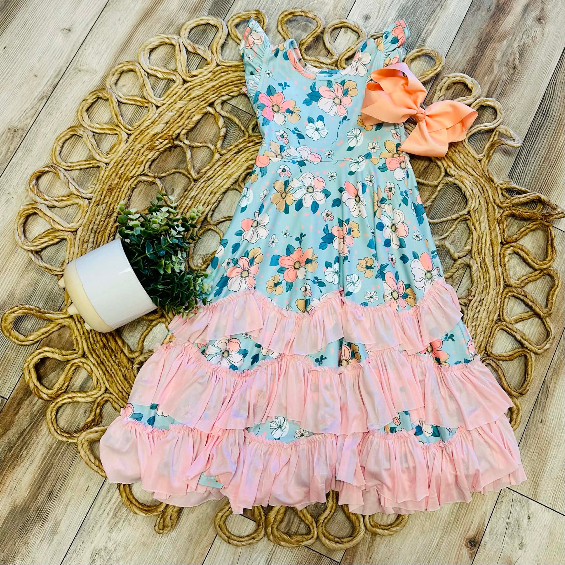 The Girls Floral Ruffle Bottom Maxi Dress features an elegant floral design combined with a functional ruffle bottom. This dress offers a comfortable fit for active wear, promoting ease of movement. The breathable fabric ensures comfort in various climates, making it a versatile addition to any child's wardrobe.