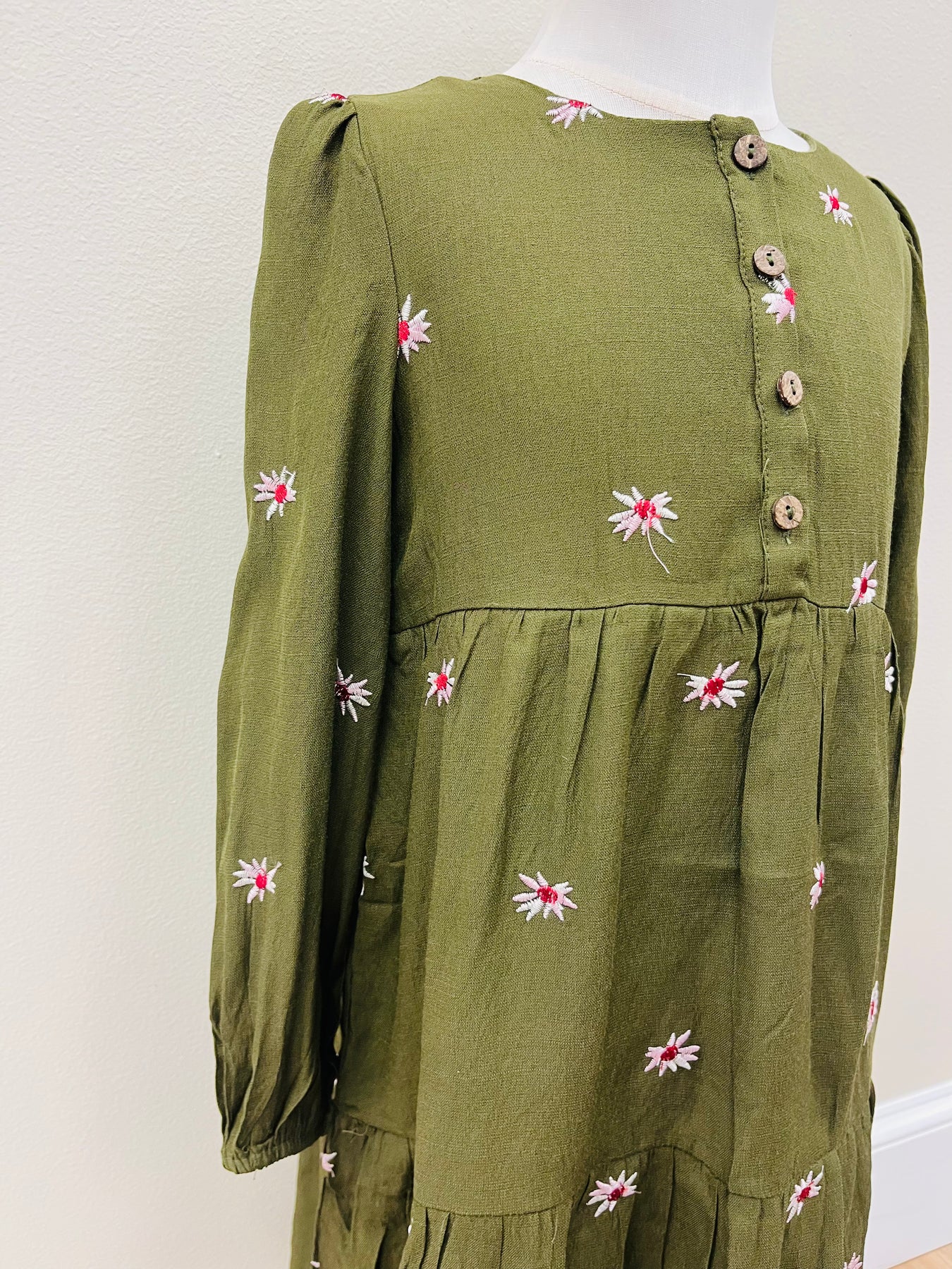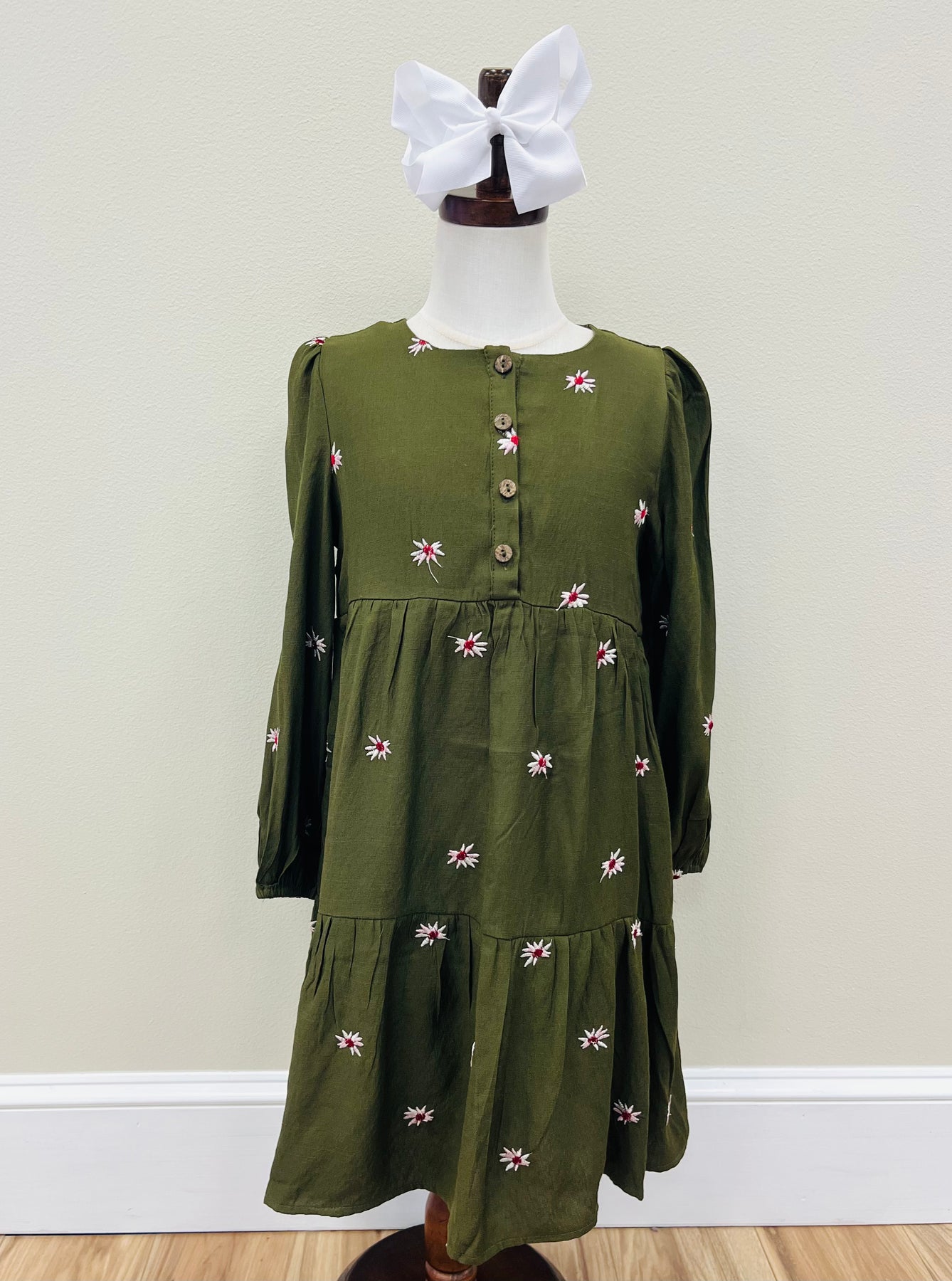 This girls' dress features a 1/2 button detail, adding a touch of elegance to the overall design. The high-quality fabric is detailed with a vibrant olive floral print, making it a perfect choice for any occasion. With this dress, your little one will feel comfortable and stylish all day long.