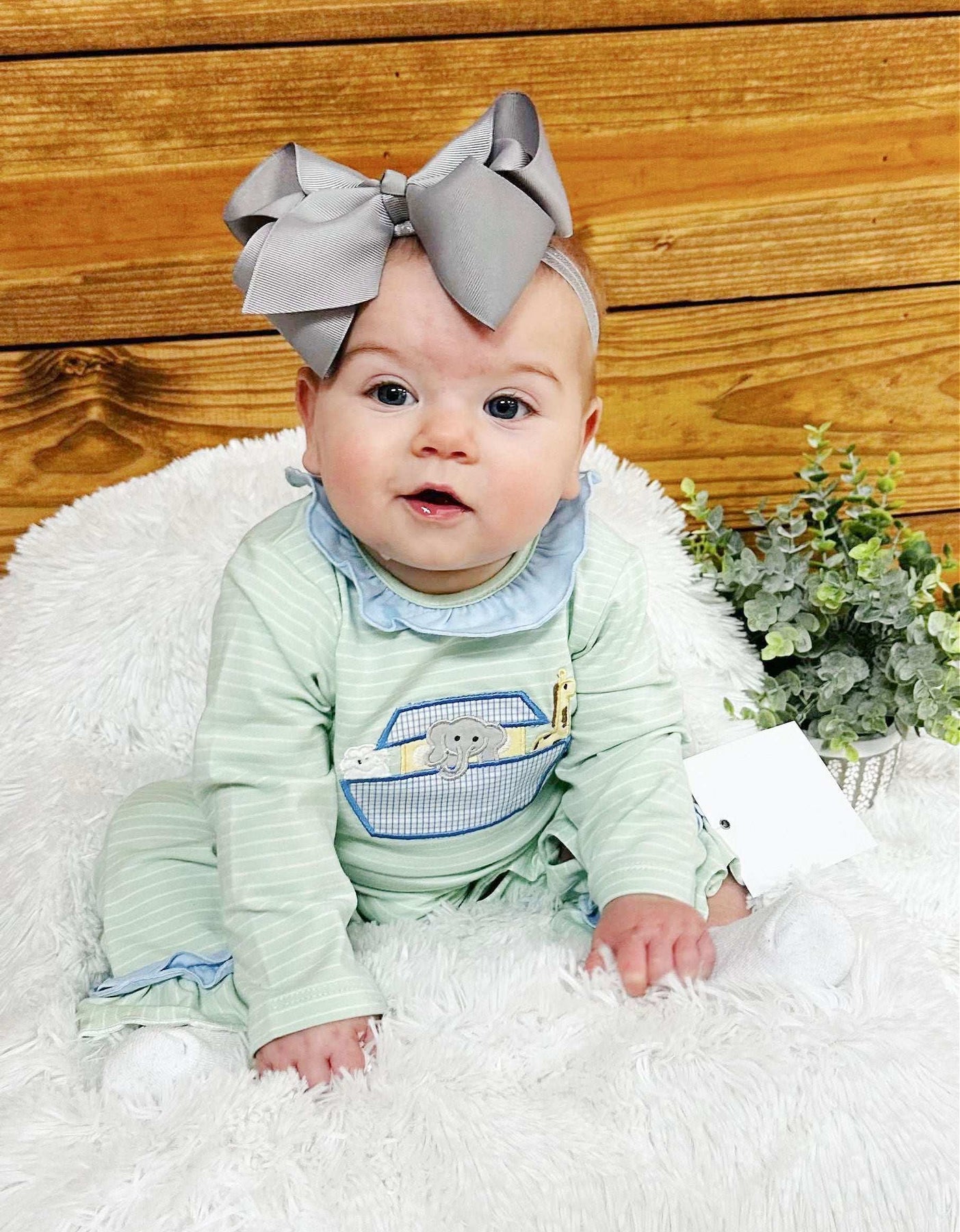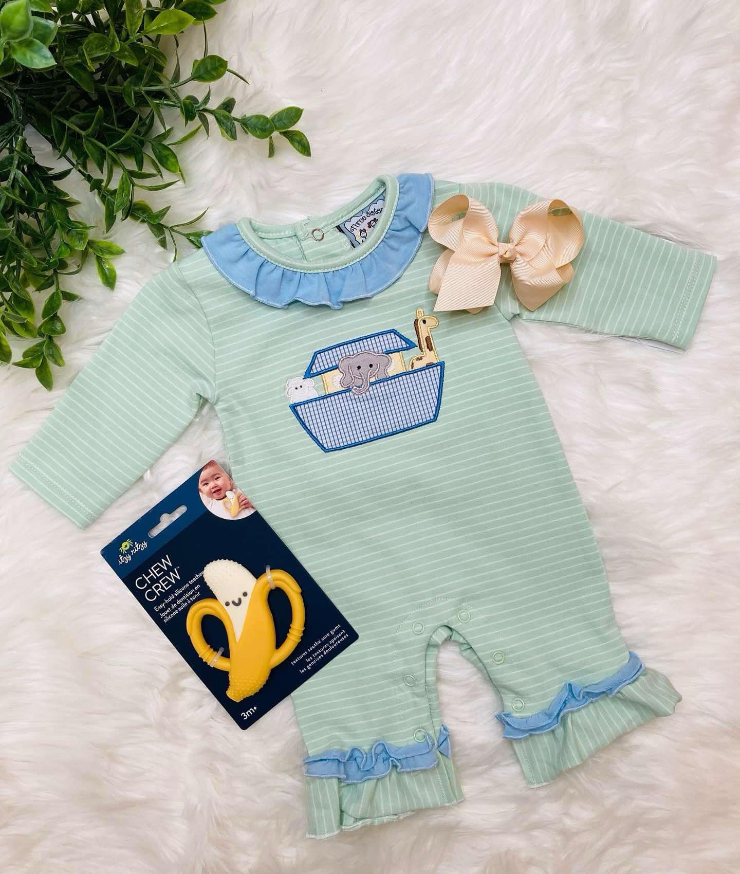 Introduce your little one to the timeless tale of Noah's Arc with our Girls Green Striped sleeper. Featuring a playful green and white striped design, your child will be cozy and stylish all at once. Made with quality materials, this sleeper is sure to become a favorite for both you and your little one.
