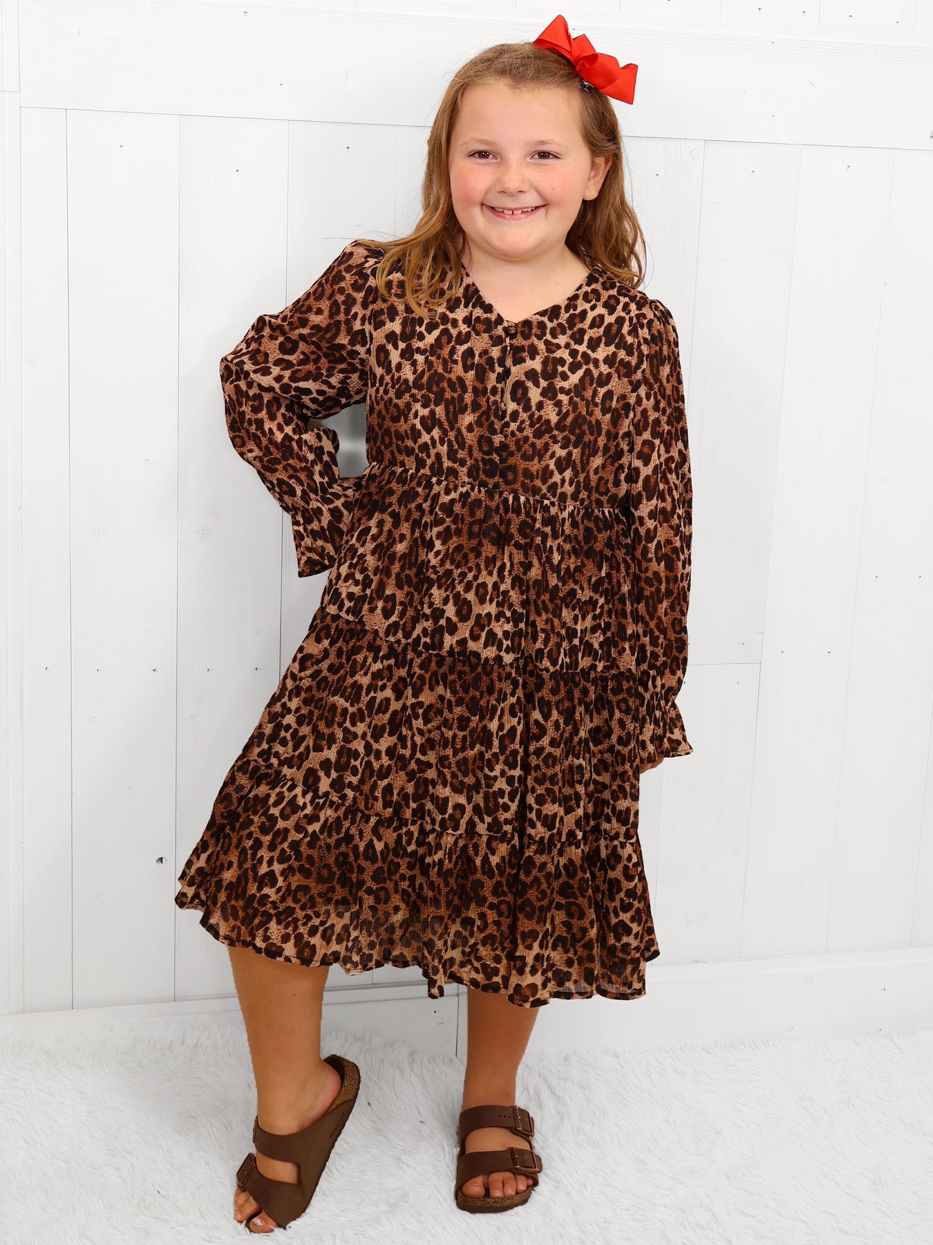 This Hayden Girls Cheetah Ruffle Dress adds a wild touch to any wardrobe. The all-over cheetah print and ruffle detailing make a bold statement with a touch of feminine flair. Made with high-quality materials, this dress offers both comfort and style for your little one.