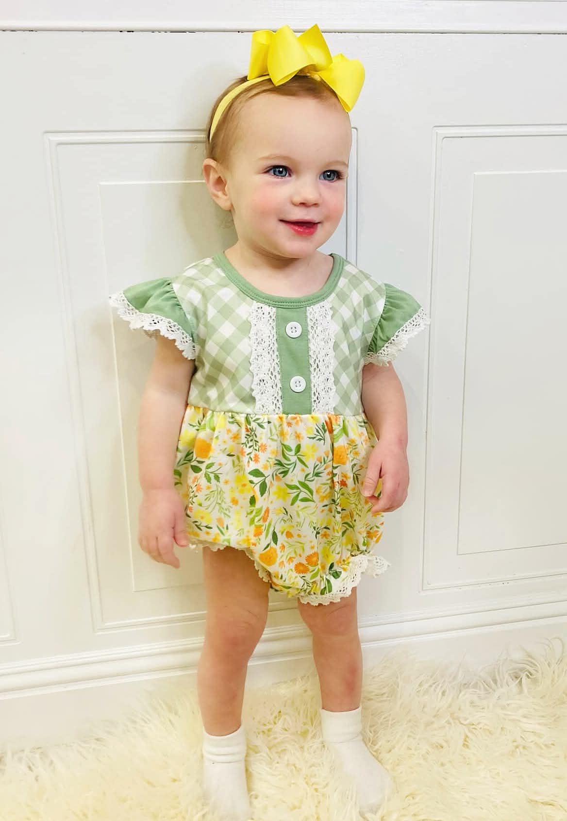 Introducing the Cutesie Floral Outfit, a must-have for any fashion-forward baby. This adorable ensemble features a charming floral pattern in a soft combination of baby green and yellow. The checkered design adds a classic touch to this modern outfit. Dress your little one in style and comfort.