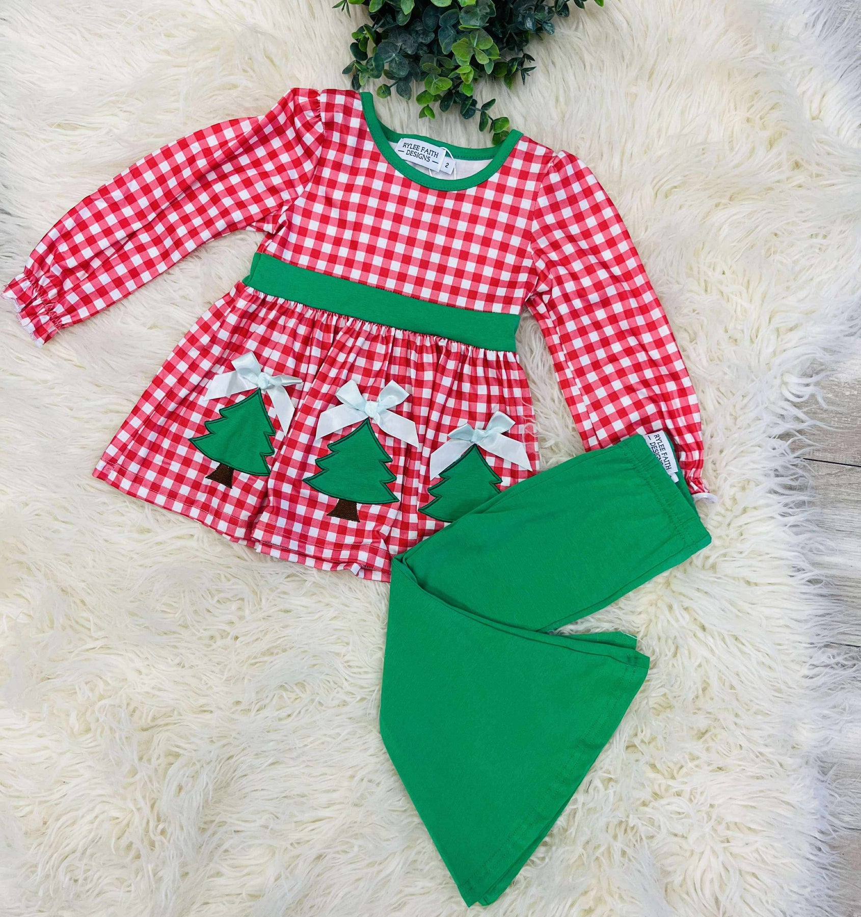This Girls Christmas Tree Plaid Set is the perfect outfit for any holiday occasion. The set includes a festive plaid top and coordinating pants for a complete look. Made with high-quality fabric, this set offers both comfort and style. Get your little one ready for the holiday season with this adorable set.