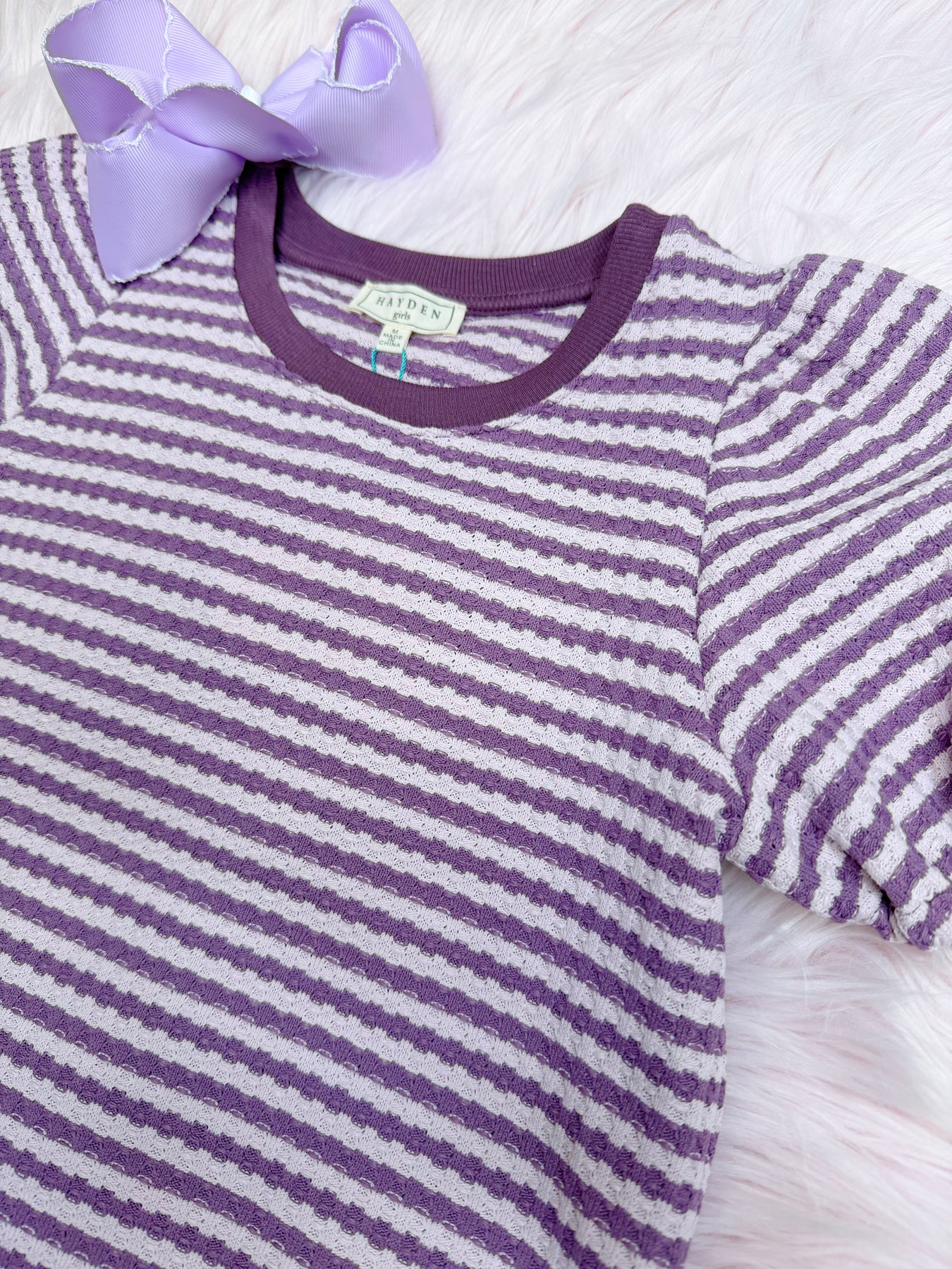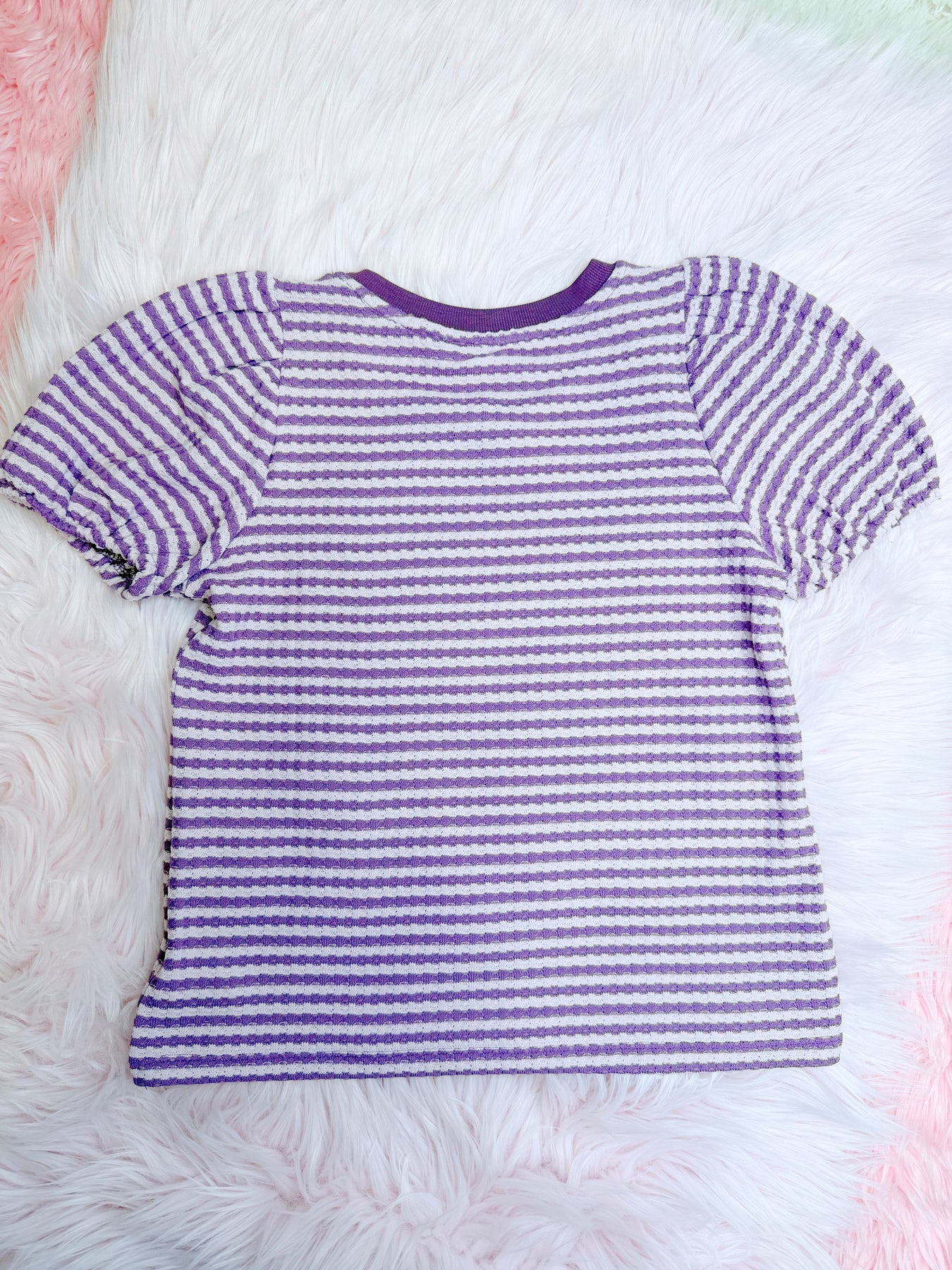 This Girls Purple Striped Puff Sleeve Top adds a touch of sophistication to any outfit. Its striped design is stylish and versatile, making it perfect for any occasion. Made with a high-quality material, this top provides comfort and durability.