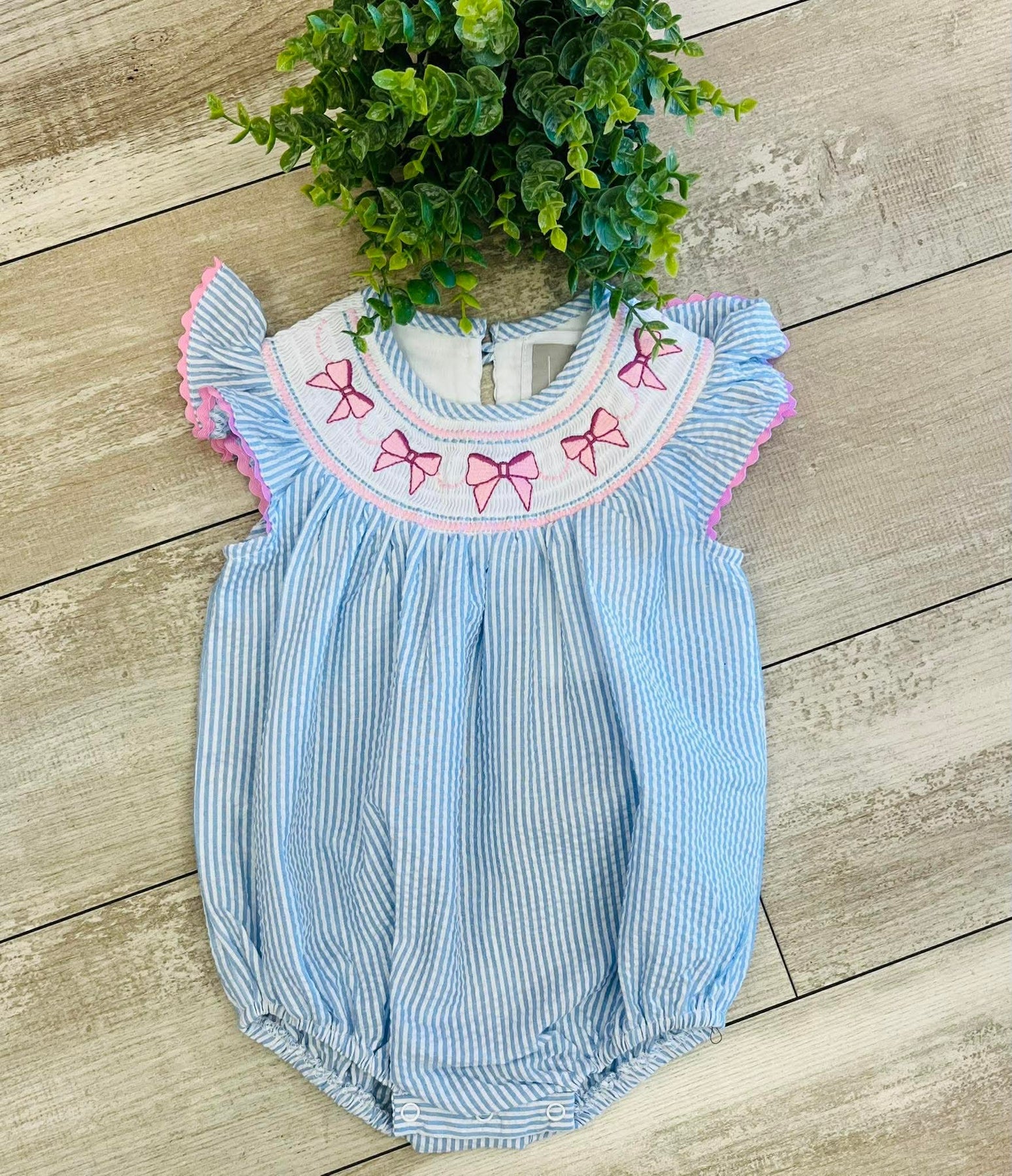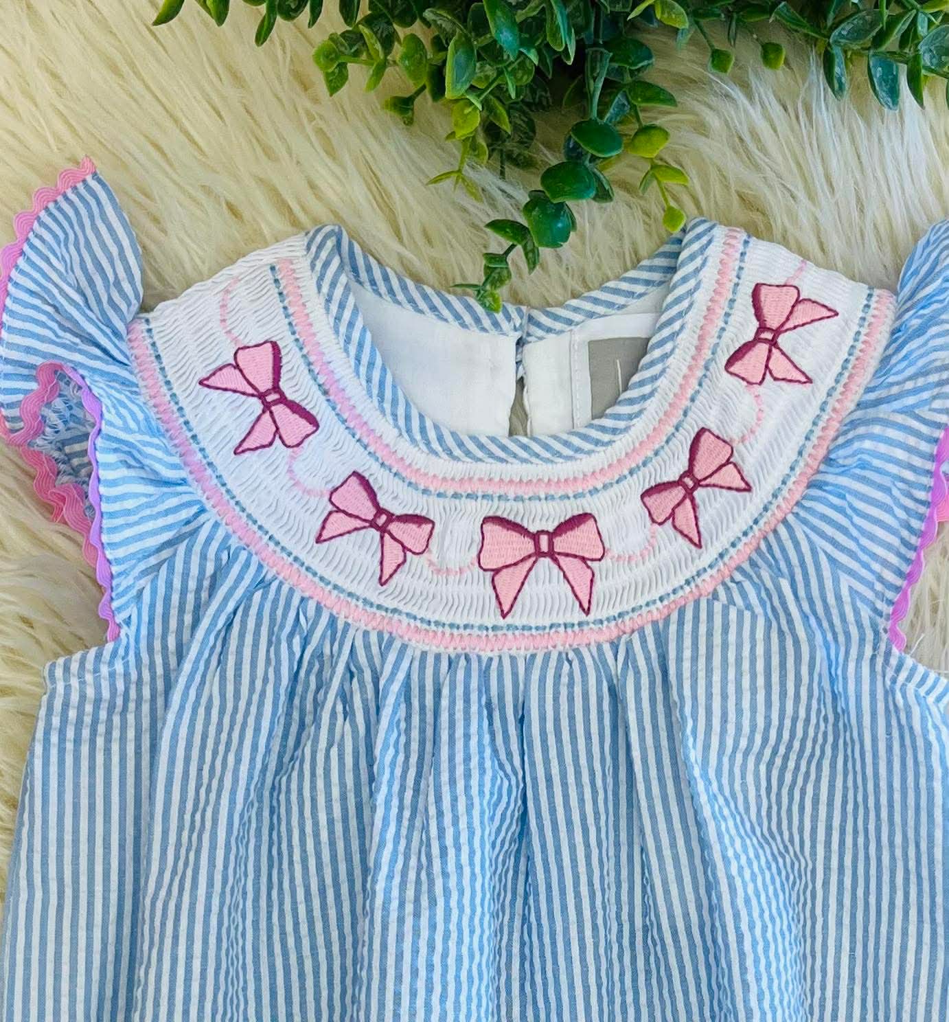 Girls Smocked Seersucker Bow Romper