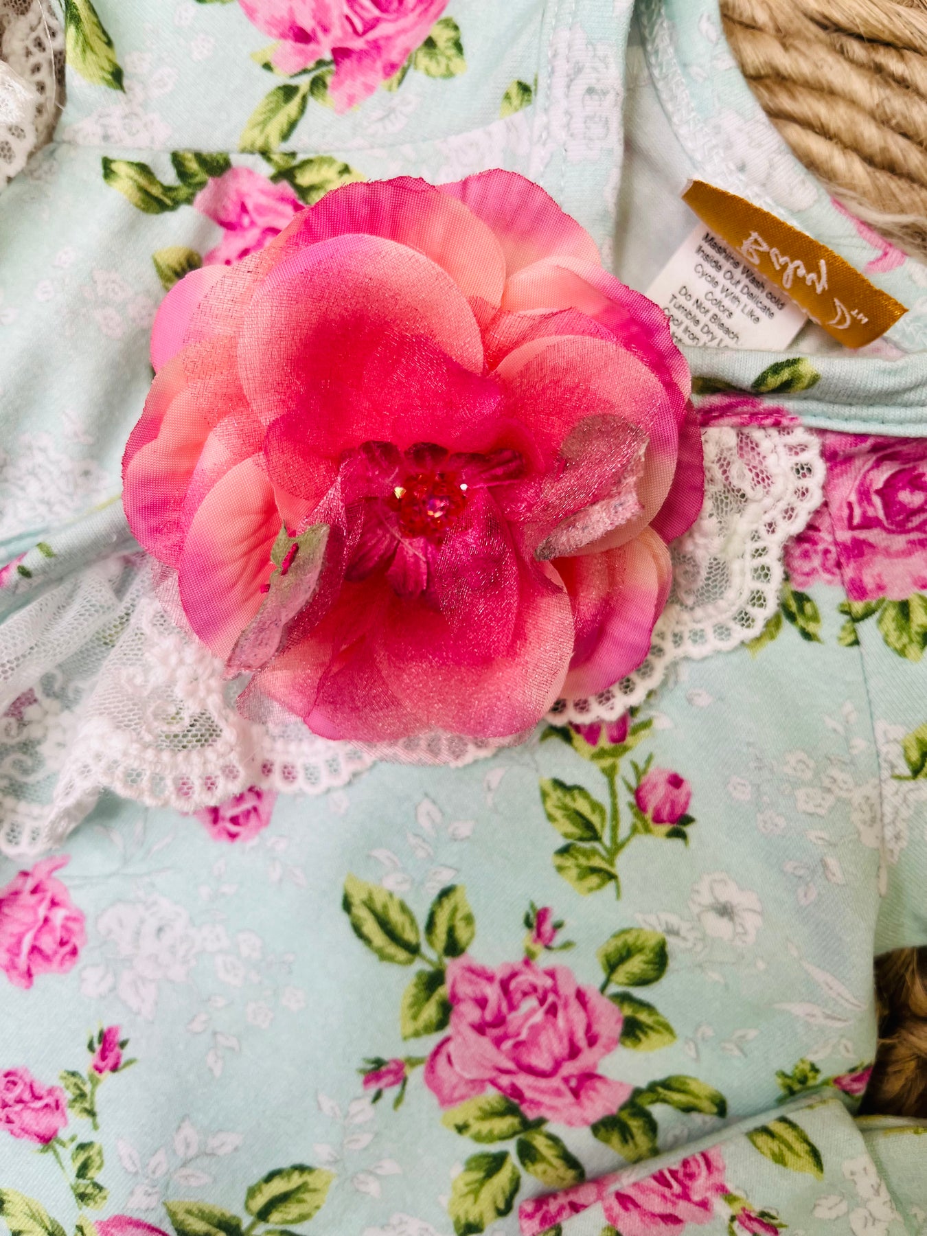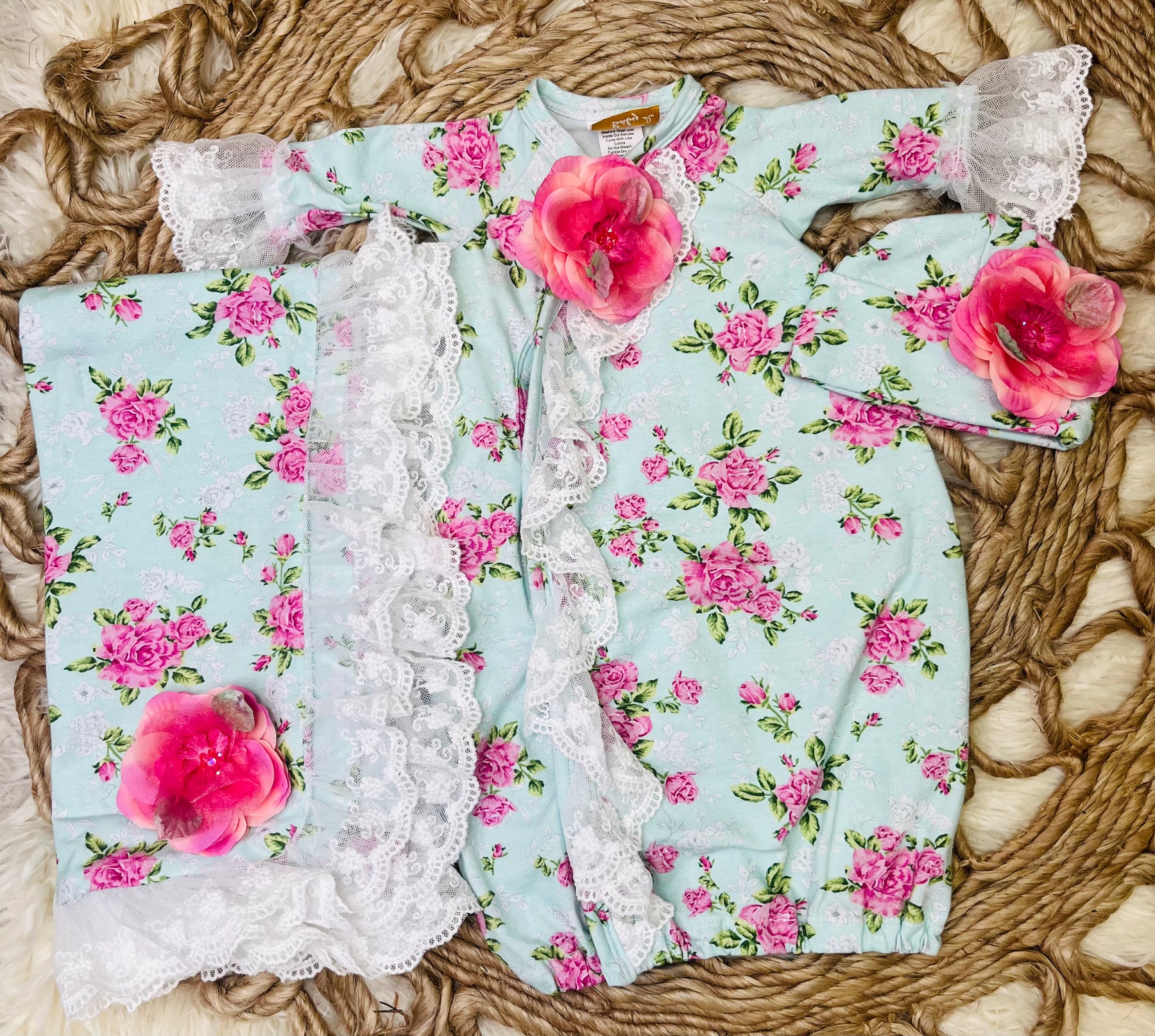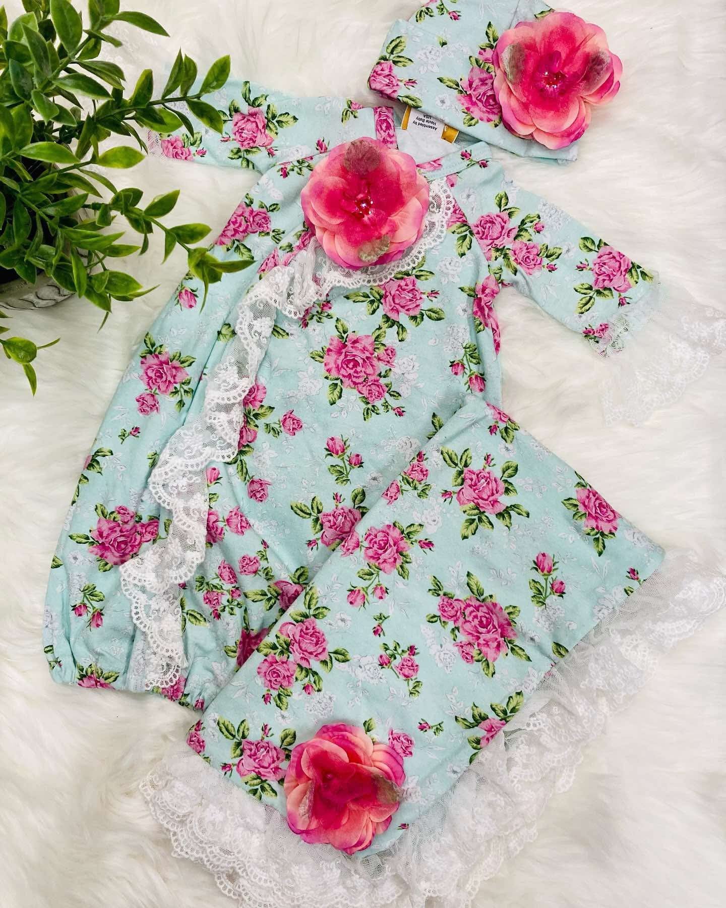 This newborn sleeper from Haute Baby is both adorable and high-quality. The pink and blue floral pattern is accentuated by delicate lace details, creating a beautiful and charming look. Complete the set with a matching blanket for added comfort and style. Perfect for your little one's first pictures or everyday wear.