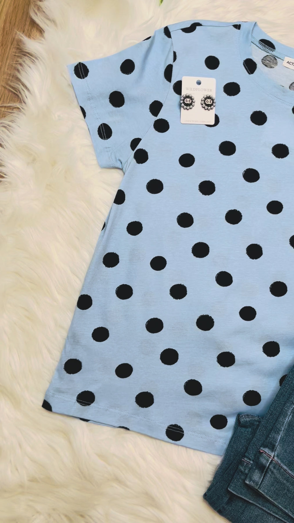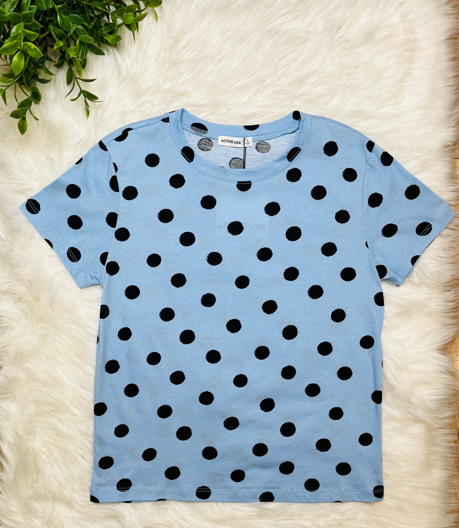 The Active Basic Light Blue and Black Polka Dot T-shirt offers superior comfort through its soft fabric composition, designed to enhance wearability. This garment's lightweight nature facilitates moisture management, promoting breathability and maintaining a comfortable body temperature during physical activities. Ideal for both casual and active settings.