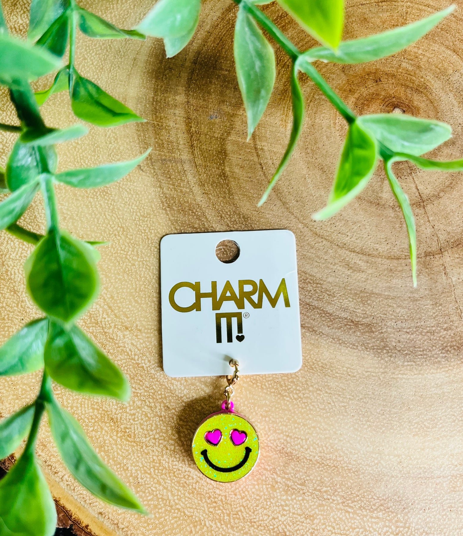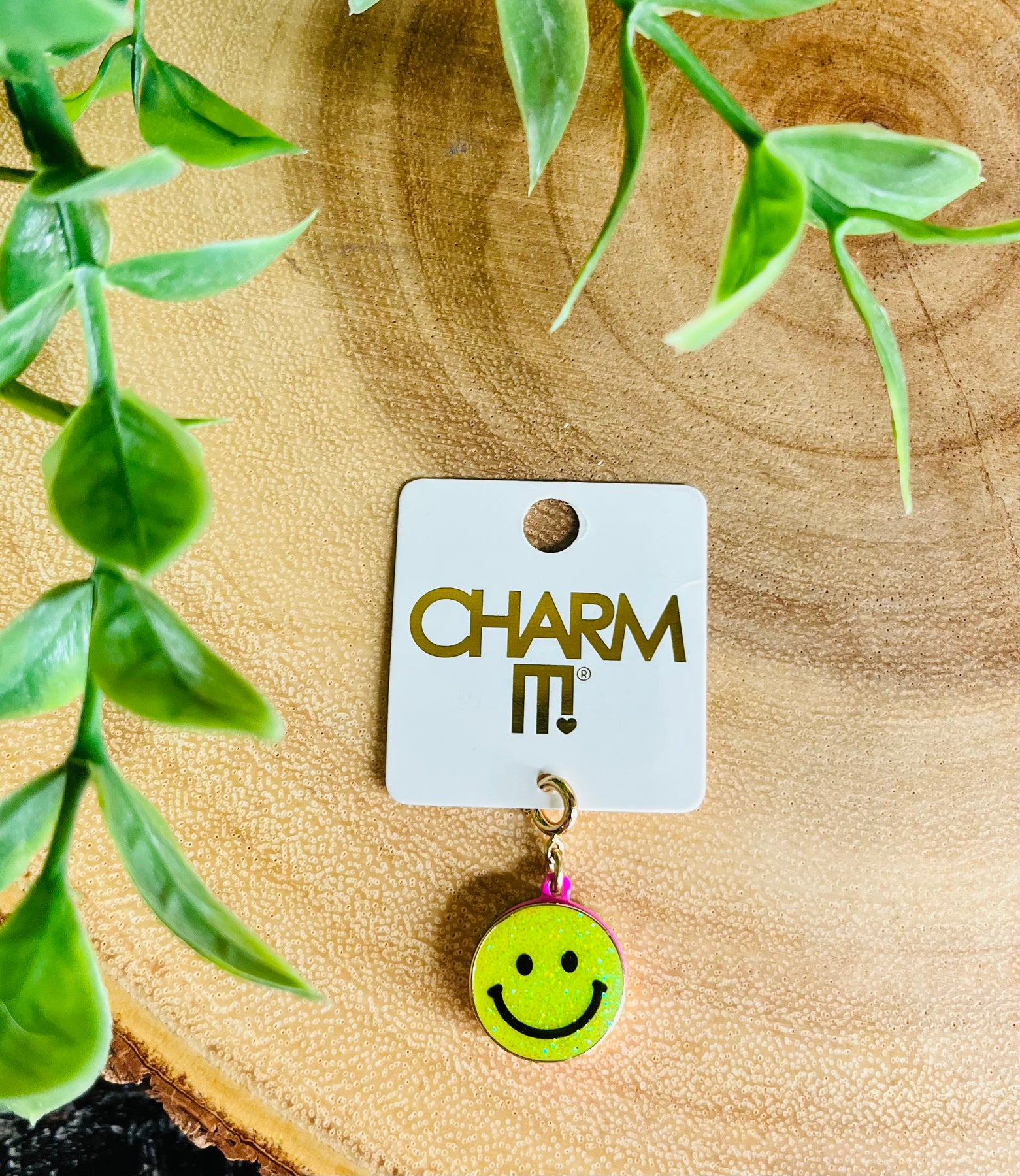 The Charm It double side smile charm features a versatile design that allows for dual display. Measuring approximately 1 inch in diameter, this charm is crafted from durable materials to ensure long-lasting wear. It adds a playful element to jewelry collections, appealing to children and adults alike.