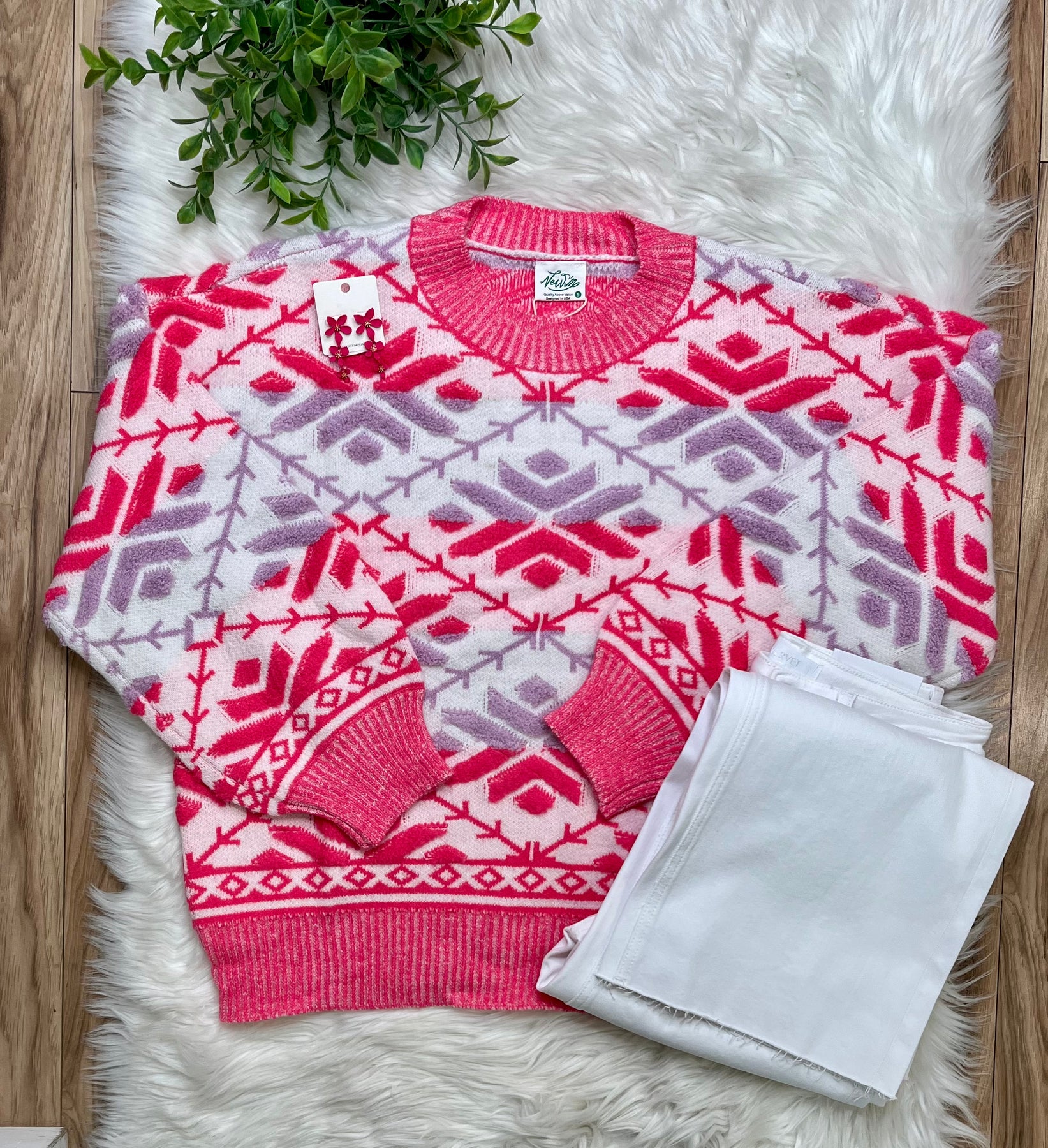 Don’t sacrifice comfort for fashion when you can get the best of both worlds with this pink and lavender knit sweater! Crafted with a cozy sweater fabric, this print adds a touch of uniqueness to any outfit!