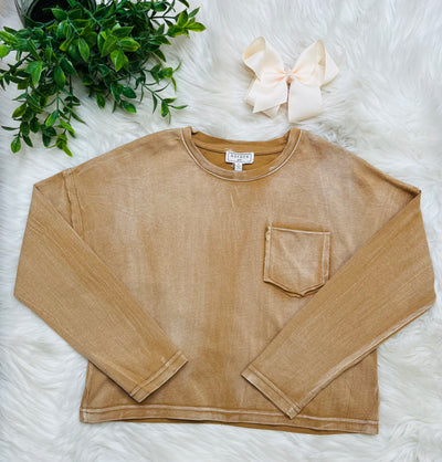 Zenana Ribbed Raw Edge Pocket Top Light Mocha