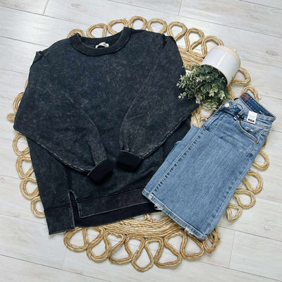 Zenana Acid Wash Terry Exposed Seam Sweater Pullover Ash Black