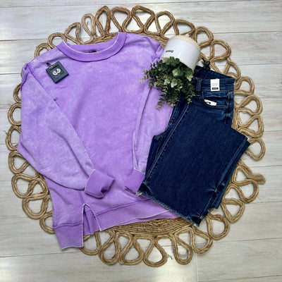 Zenana Acid Wash Terry Exposed Seam Sweater Pullover Lavender