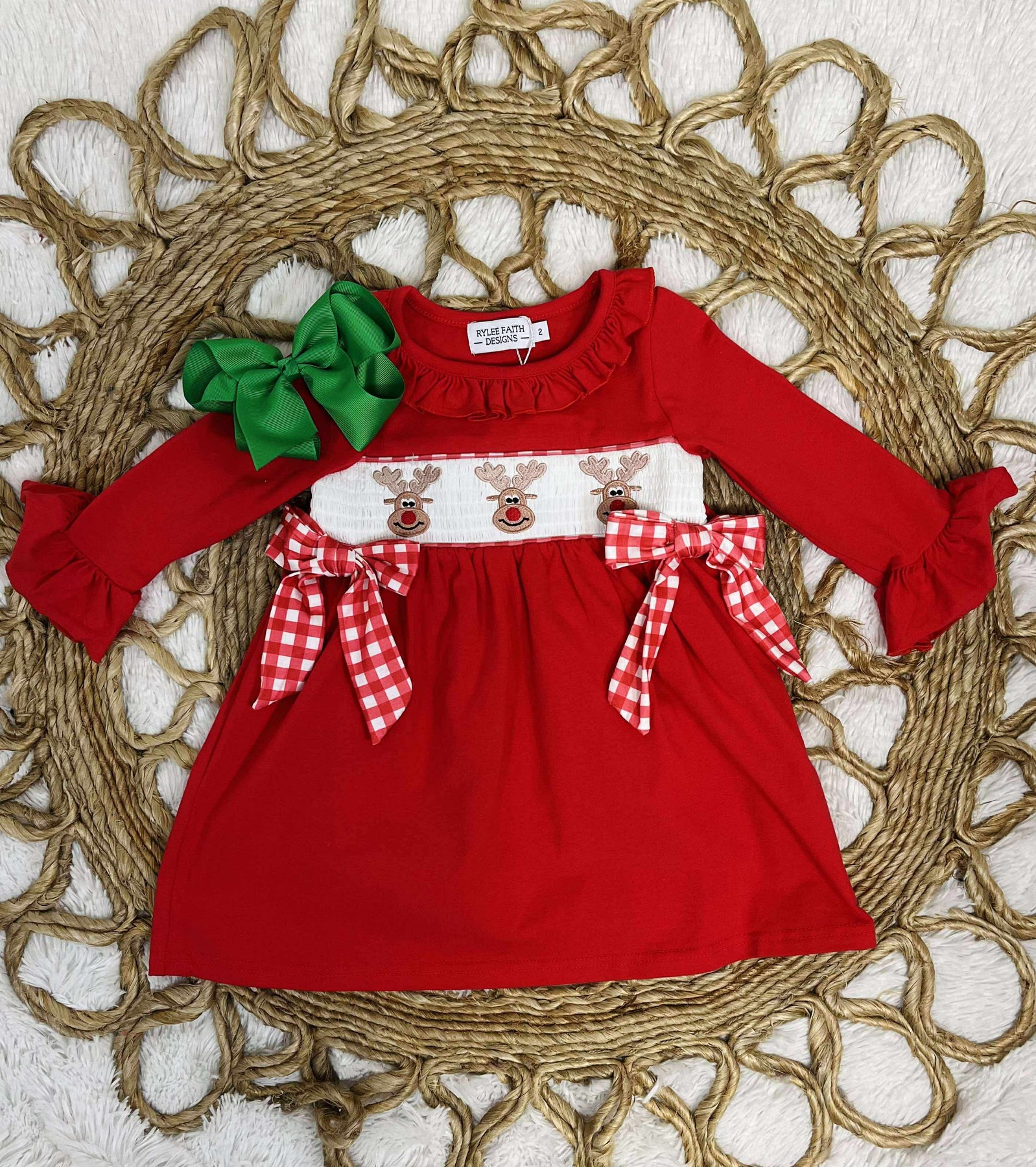 This Girls Red Smocking Reindeer Holiday Dress features a festive Rudolph design. Made with high-quality materials, this dress is perfect for holiday events and gatherings. Its smocking detail adds elegance, while the reindeer design adds a touch of whimsy. Dress your little one in style this holiday season with this adorable Rudolph dress.