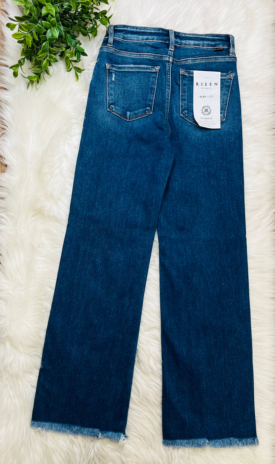 "These Risen Dark Wash Mid Rise Fray Hem Jeans offer a stylish and versatile addition to your wardrobe. Made with high-quality denim, these jeans provide a comfortable fit and a flattering mid rise. The frayed hem adds a trendy touch to any outfit. Perfect for any occasion, these jeans are a must-have for every fashion-forward individual."