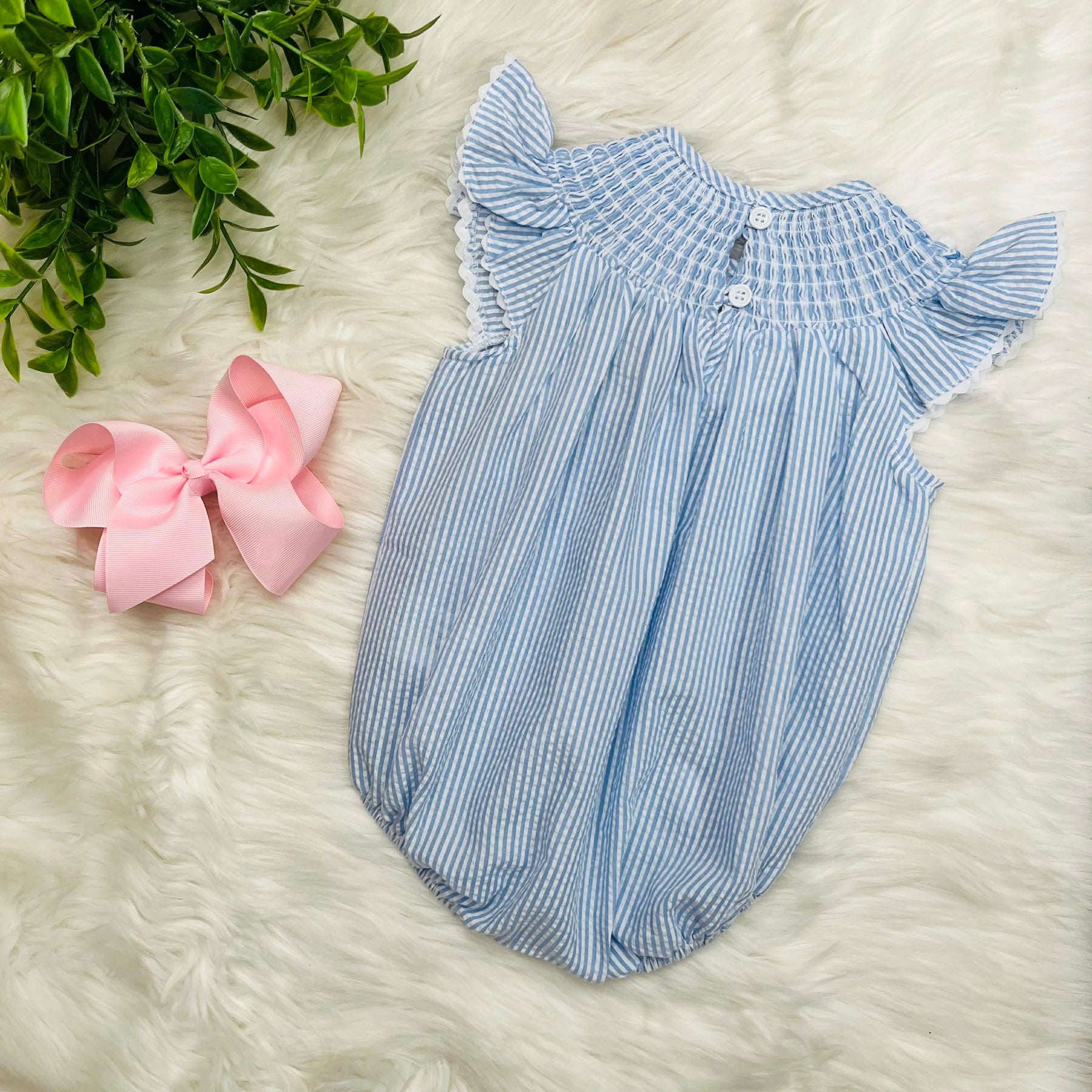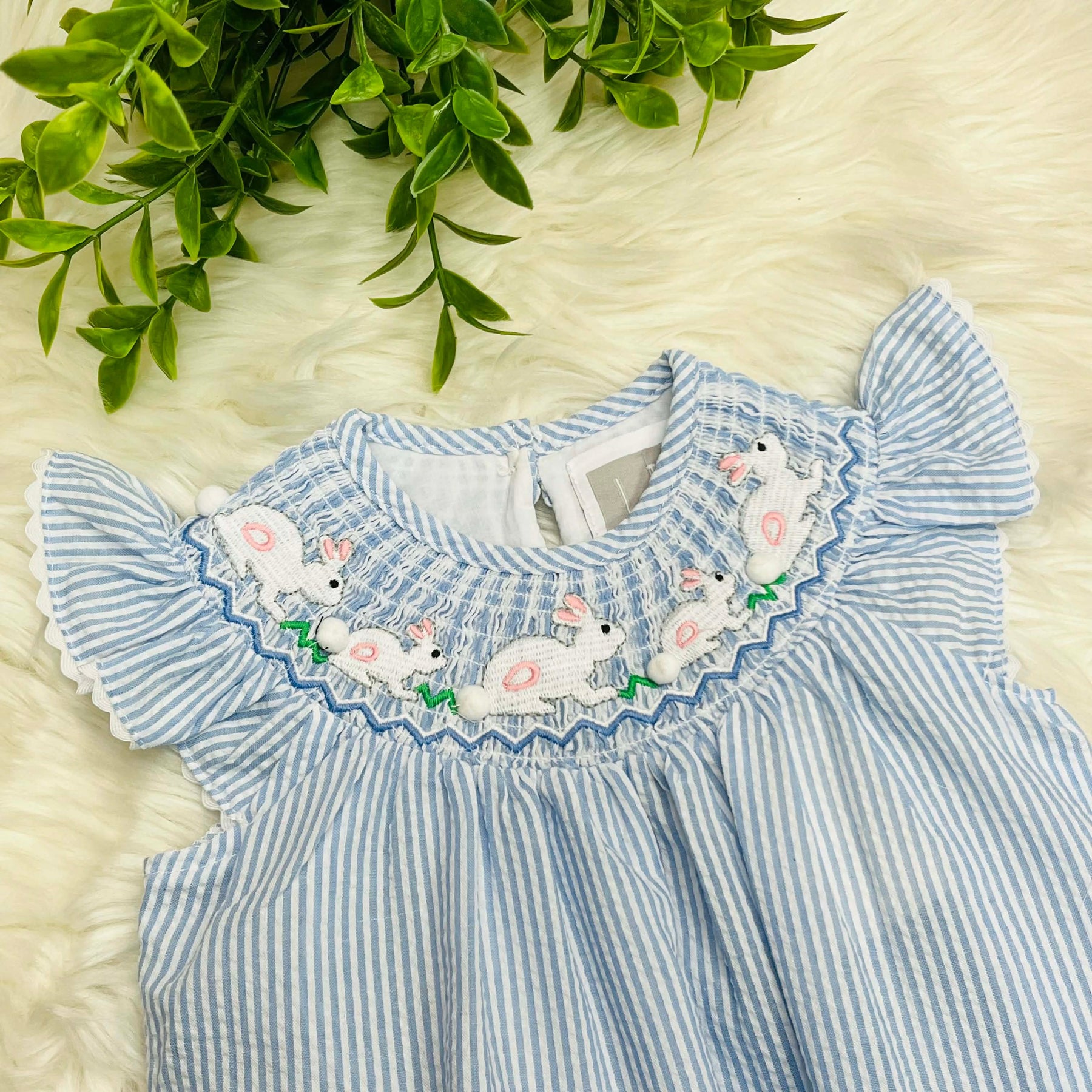 The Girls Seersucker Bunny Smocked Romper offers a lightweight construction ideal for warm weather, using breathable seersucker fabric that enhances comfort. The smocking detail provides a fitted yet flexible silhouette, ensuring ease of movement for active play. This garment is suitable for various outdoor activities, promoting comfort and style.