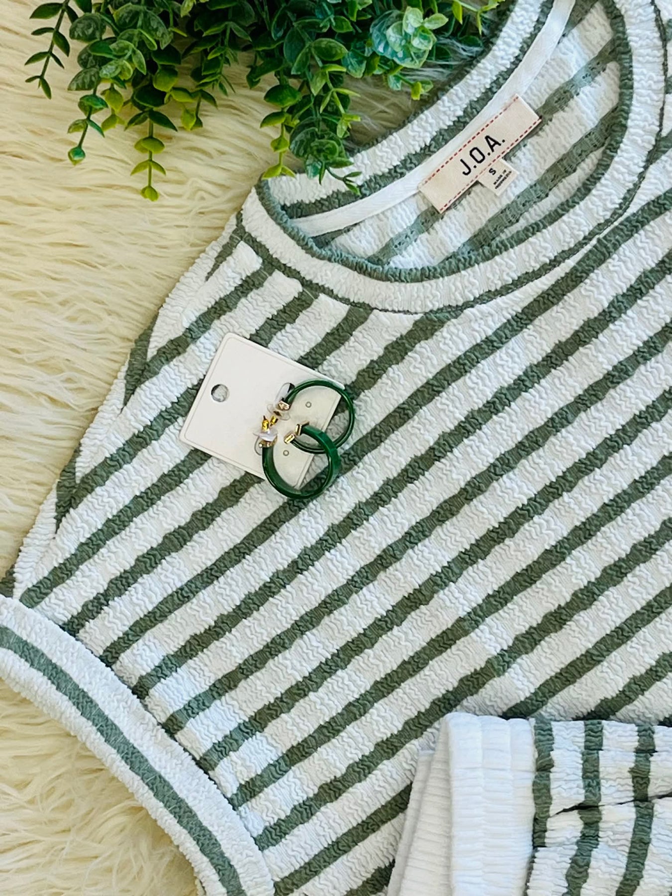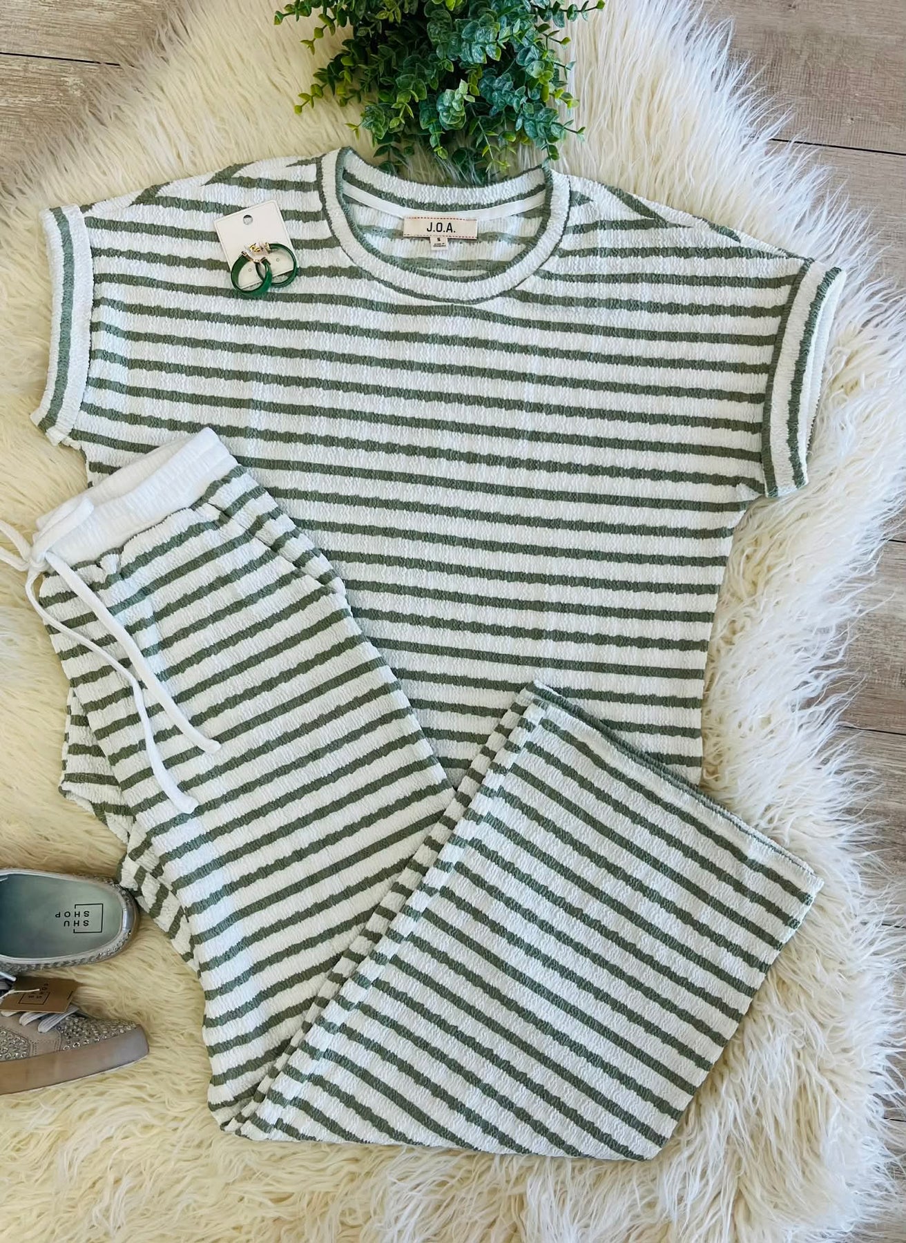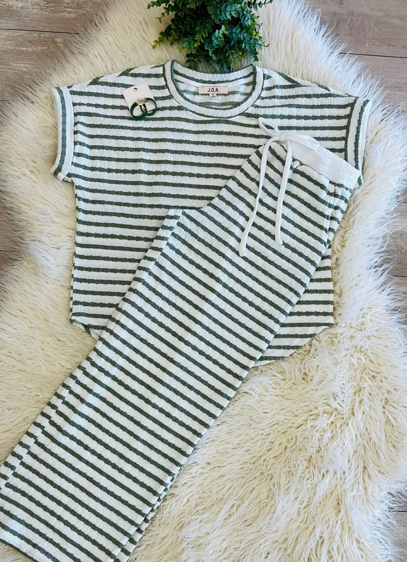 The Women’s Textured Stripe Drawstring Pant Set in Olive consists of a coordinated set designed for comfort and style. The drawstring feature allows for an adjustable fit, catering to various body types. The textured stripe adds a sophisticated visual element, making it suitable for both casual and semi-formal occasions.