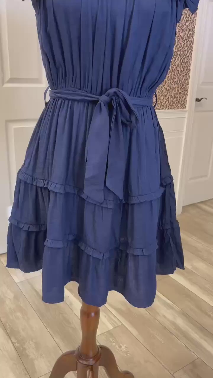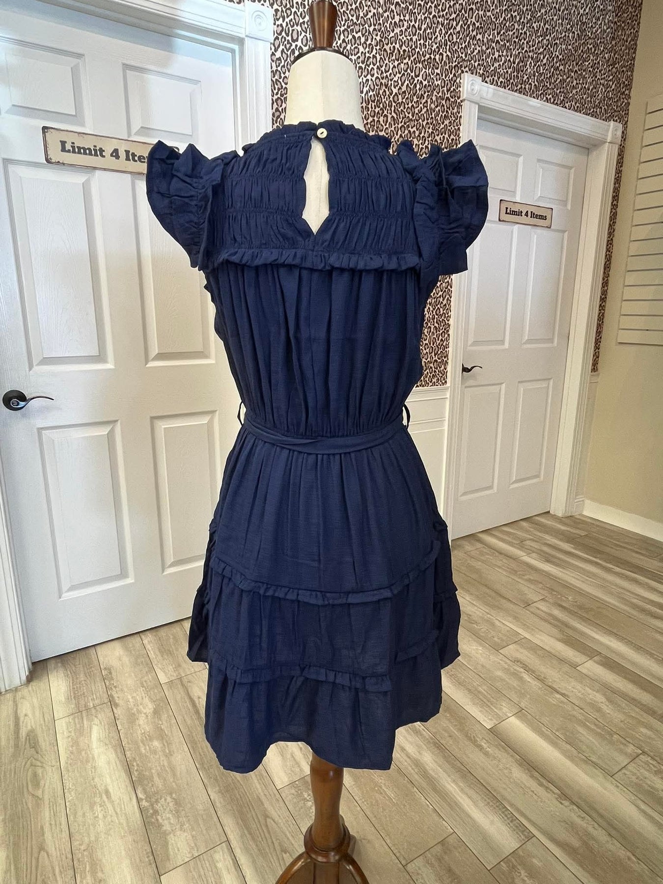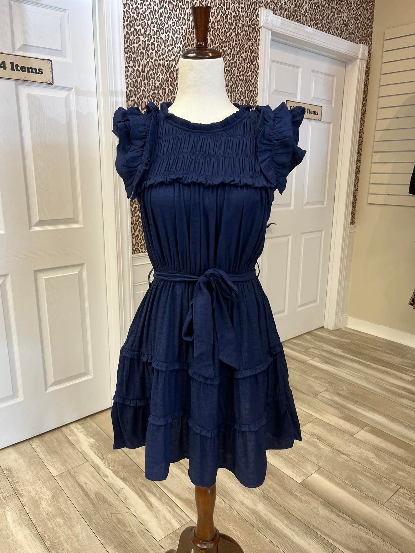 The Women's Umgee Navy Blue Ruffle Belted Dress combines style and functionality. The ruffle design enhances aesthetic appeal while the adjustable belt allows for a customizable fit. Crafted for comfort, this dress is suitable for various occasions, making it a versatile addition to any wardrobe.
