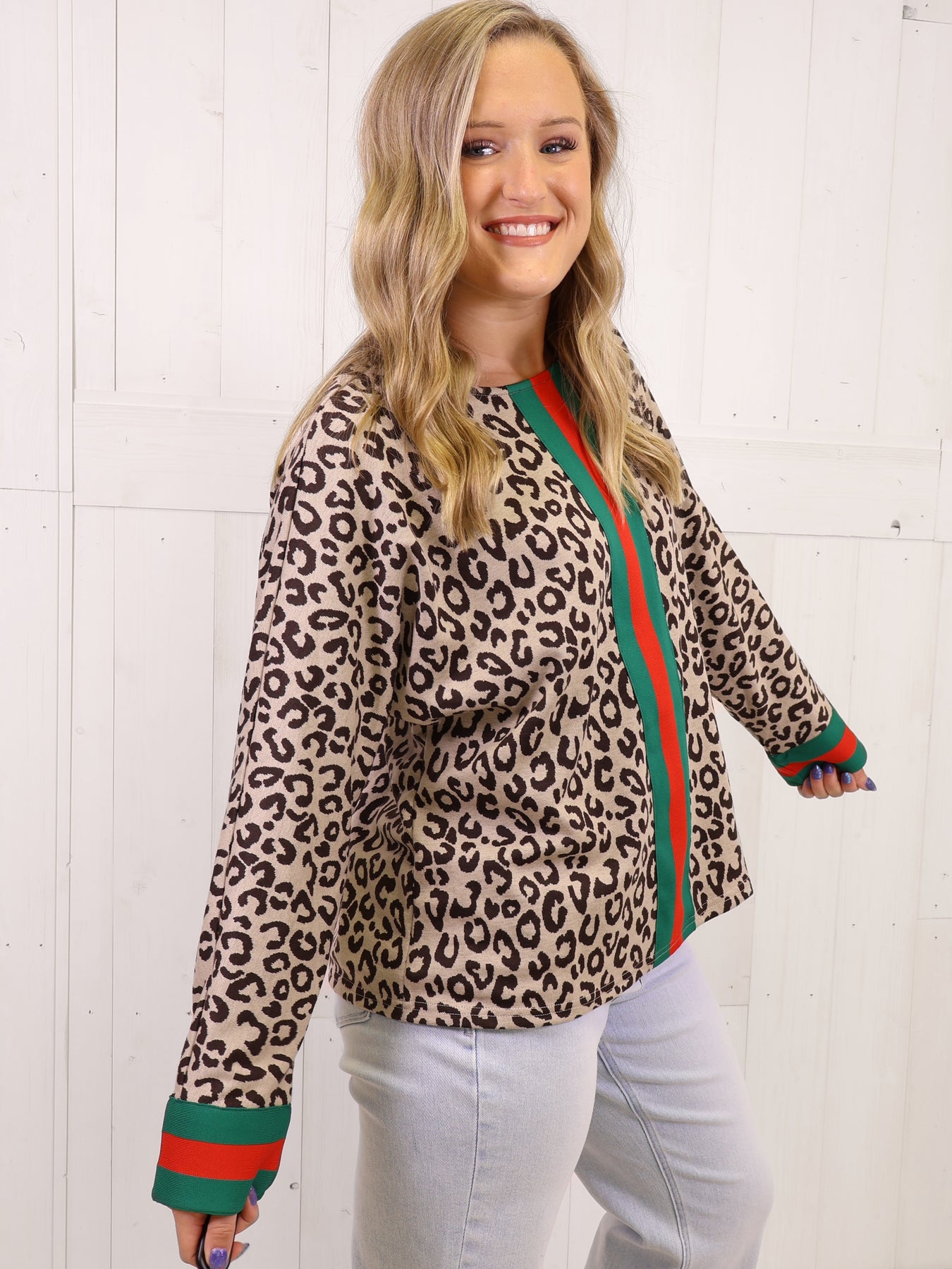 This top features a stunning cheetah print and a unique split stripe accent. The combination of bold and classic elements creates a versatile and stylish look. Made with high-quality materials, it offers both comfort and durability. Perfect for any occasion, this top is a must-have for any fashion-forward individual.