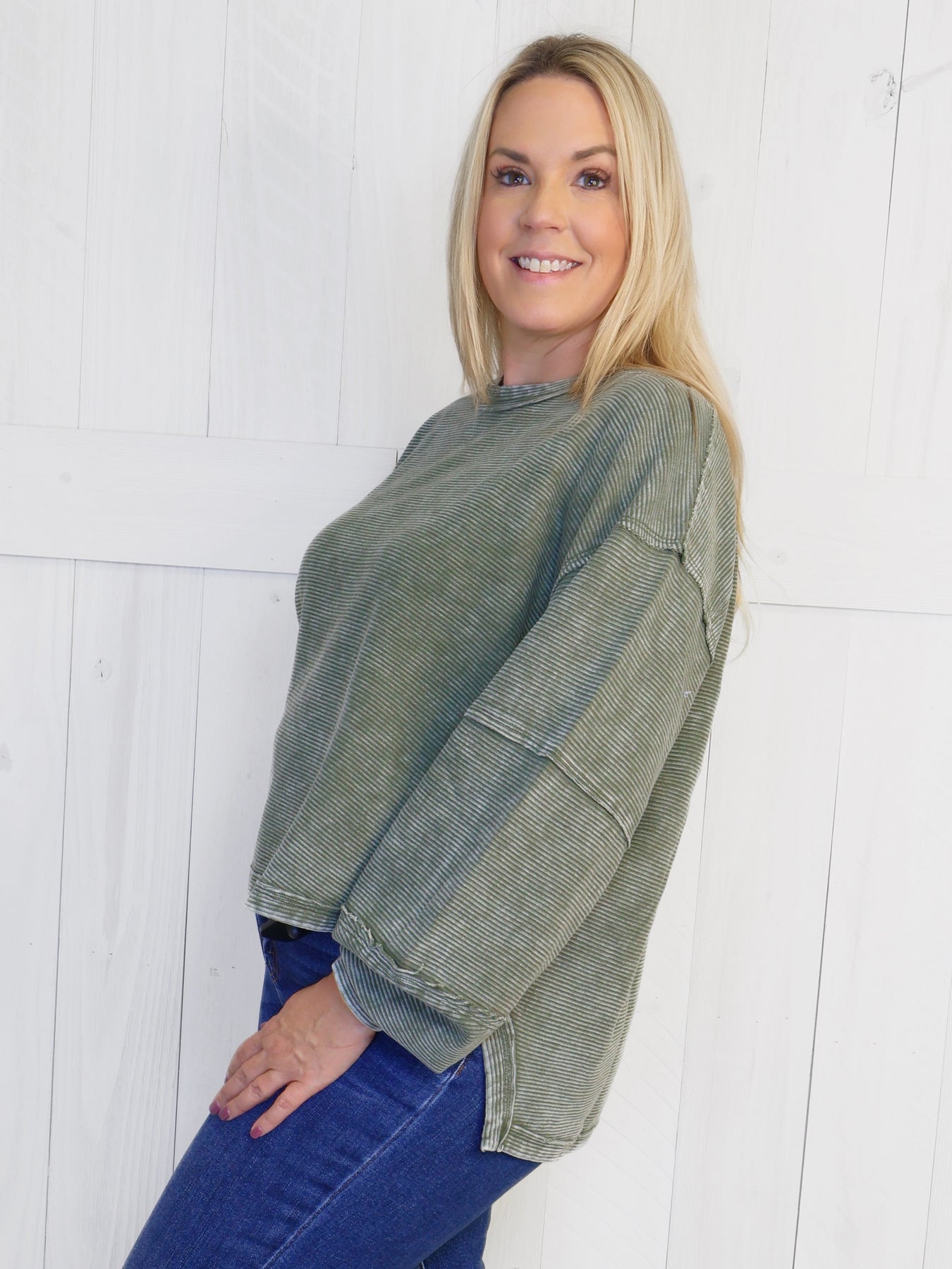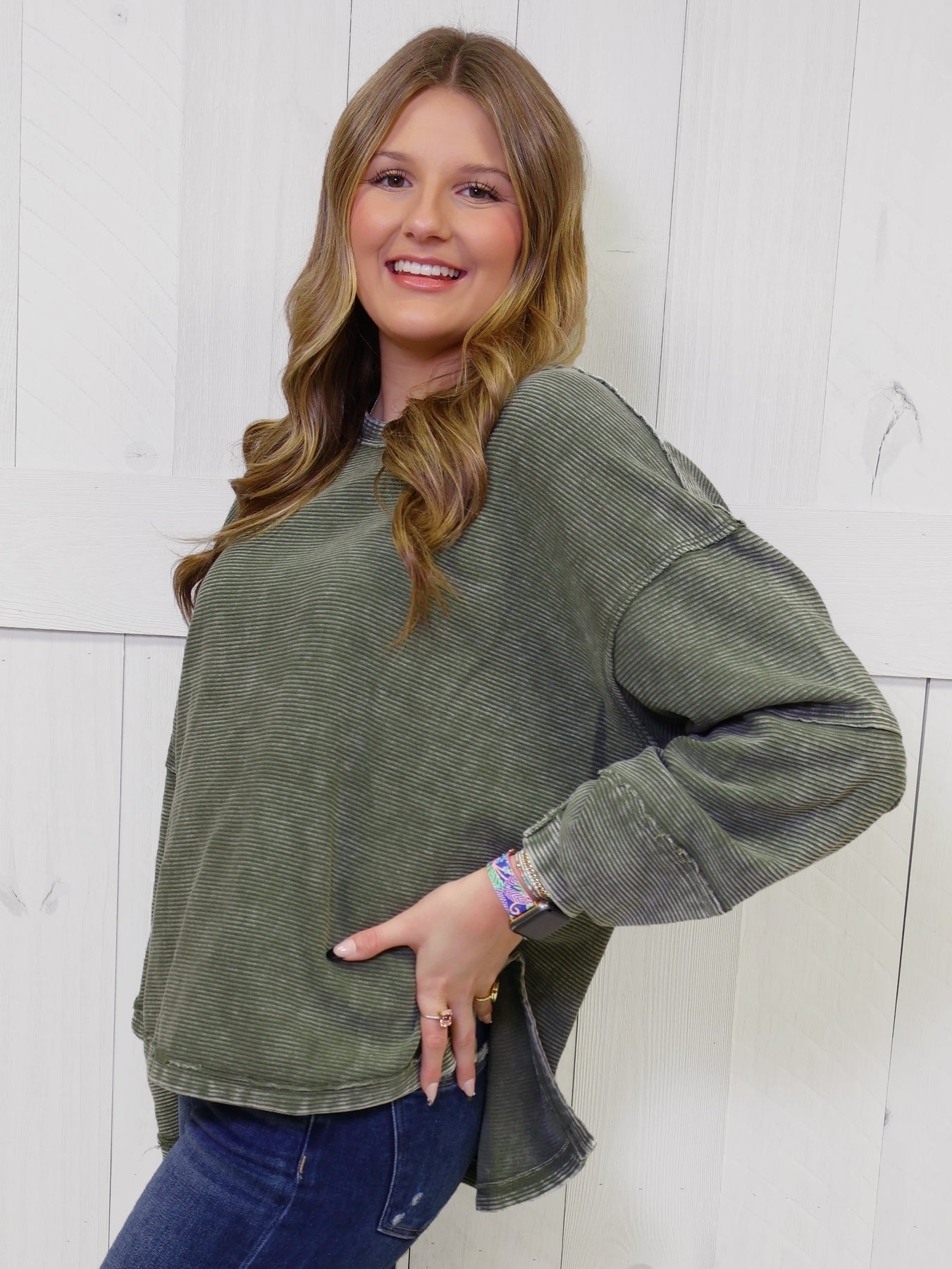 Zenana Washed Ribbed Exposed Seam Pullover Olive Sweater Top